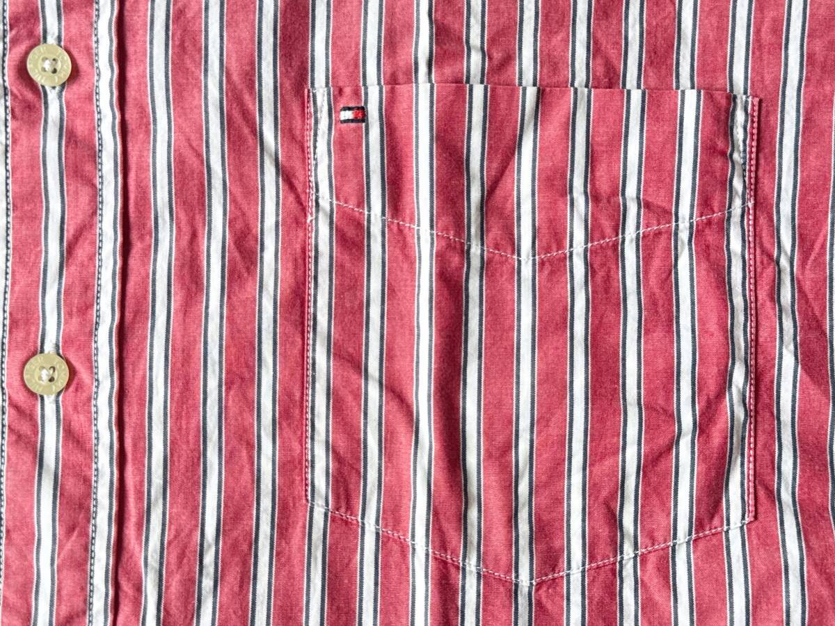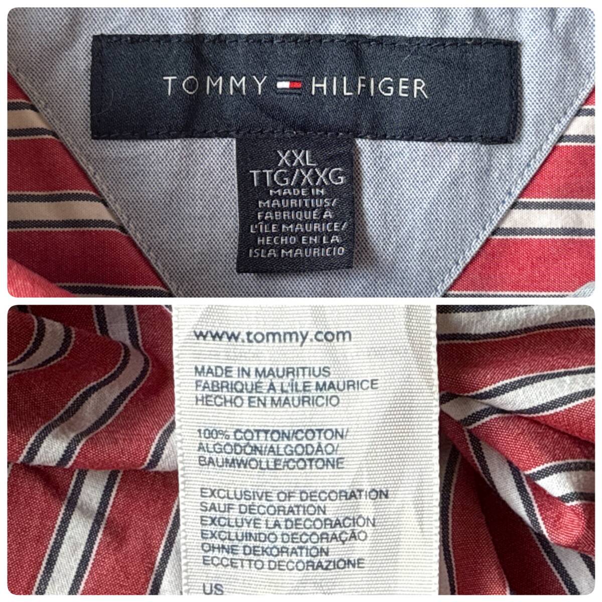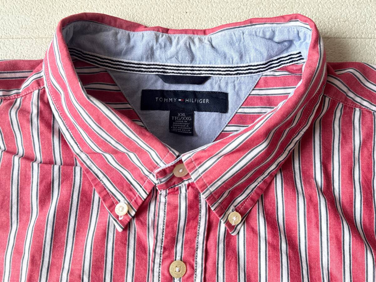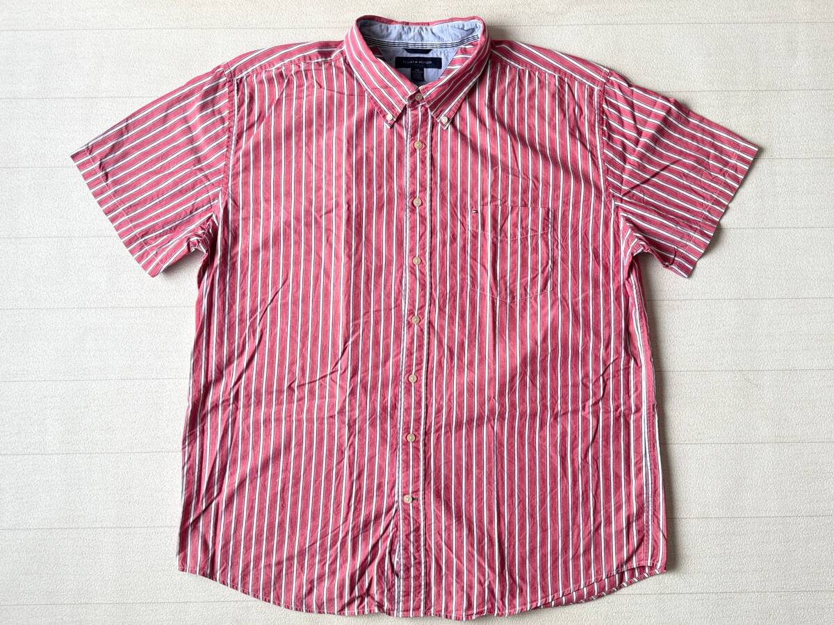 ☆送料無料☆ TOMMY HILFIGER トミーヒルフィガー USA直輸入 古着 半袖 ストライプ ロゴ 胸ポケット付き ボタンダウン シャツ メンズ XXL