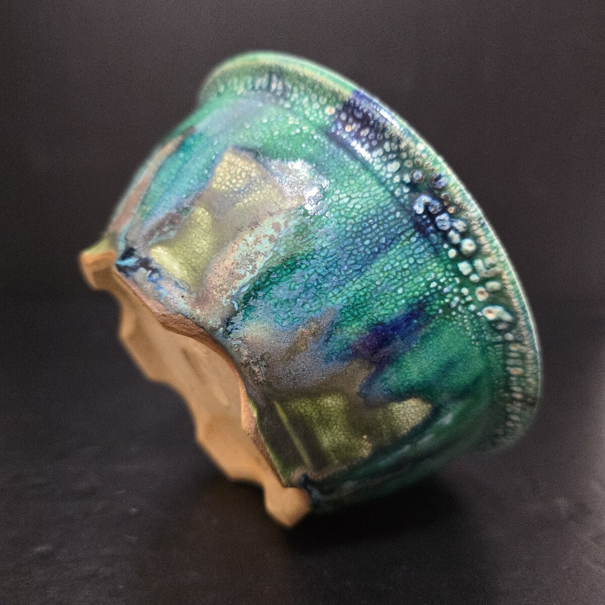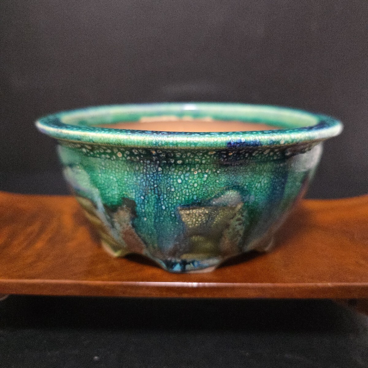 古さ抜群な味わい深い初期作になります。緑釉の窯変がとても美しく梅花皮模様も見事です。雰囲気の良い使い勝手の良い逸品小鉢になります。大きな展示会でも活躍するでしょう。