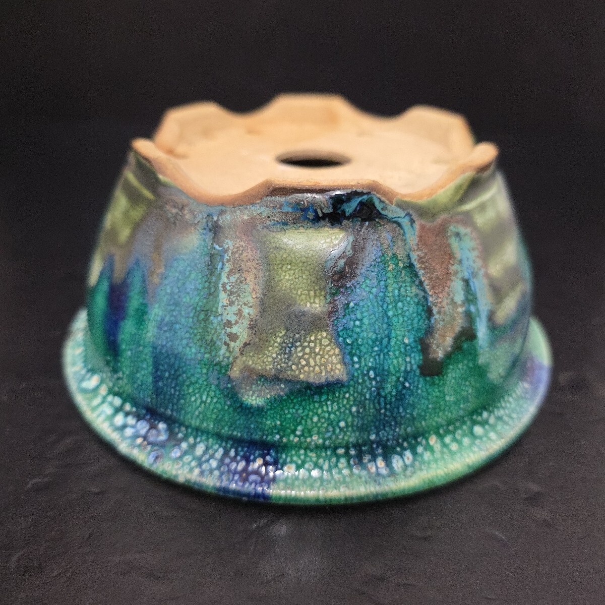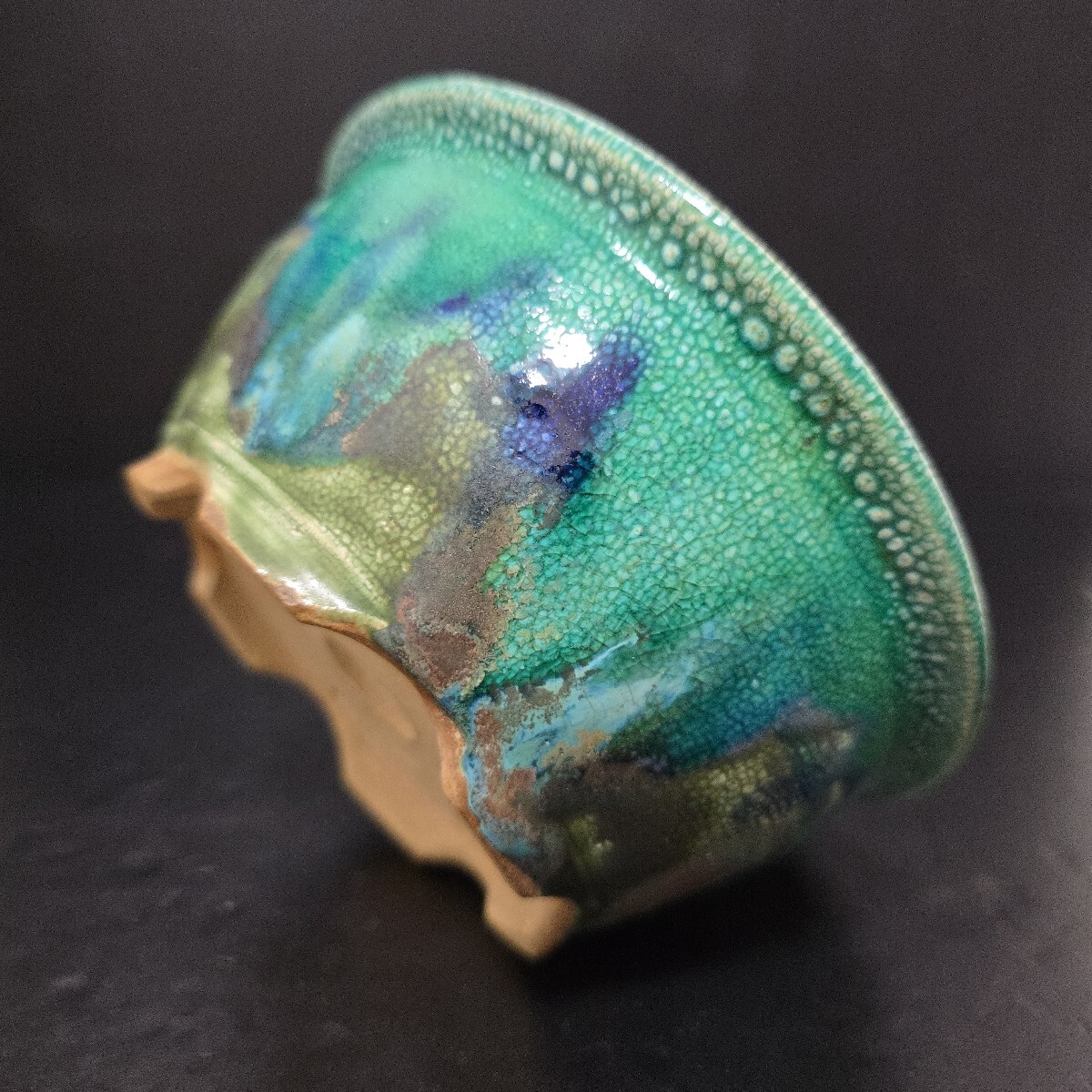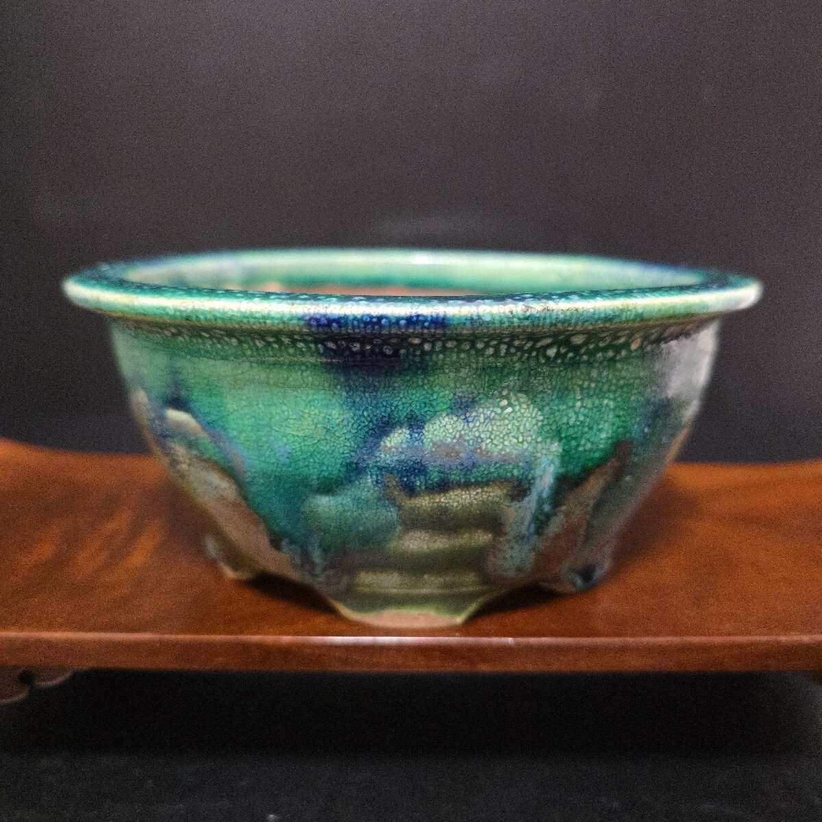 福田 茂の緑釉窯変梅花皮外縁飾足丸鉢になります。