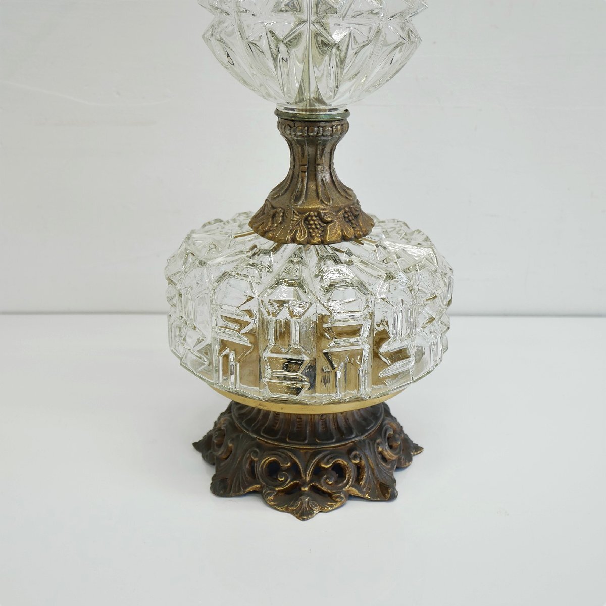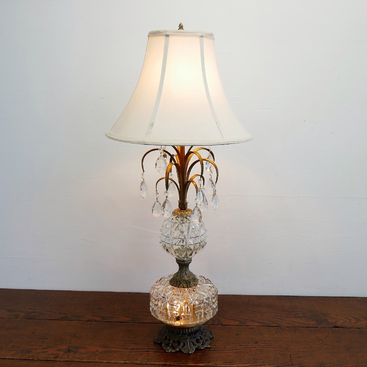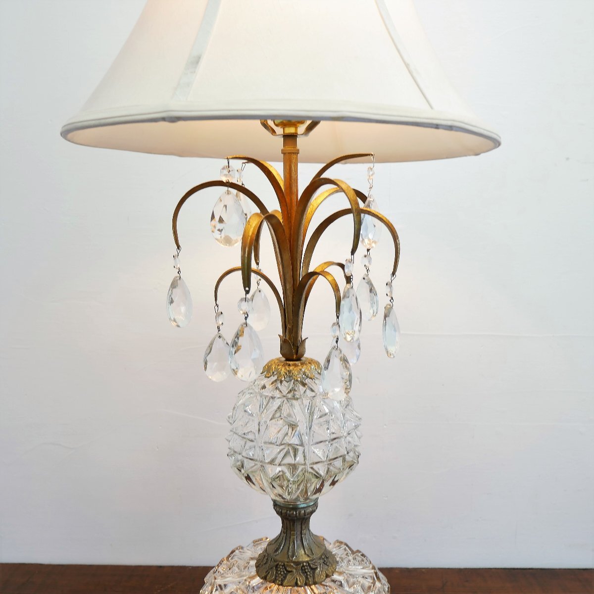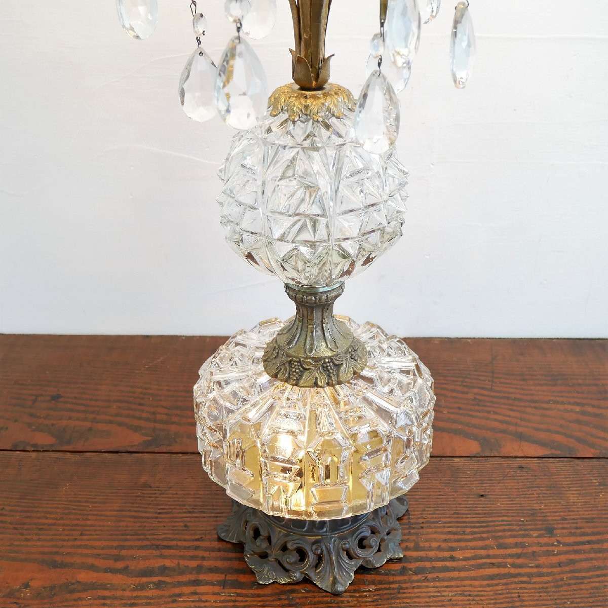 | 商品説明 explanation | 1970年代頃のテーブルランプです。 上下2灯 クリアガラスのカッティングが美しく、シャンデリアパーツ付きで、点灯するとさらに素敵です。 お部屋のインテリアなどにいかがでしょうか。 ※上はLED電球、下はナツメ球を使用しています。どちらも日本で市販されている電球です。 ※スイッチを右回しで、上下切り替え、両方、ON,OFFに替えられます。 ※シェードは布製で、台座と支柱は金属(鋳物)です。 |
