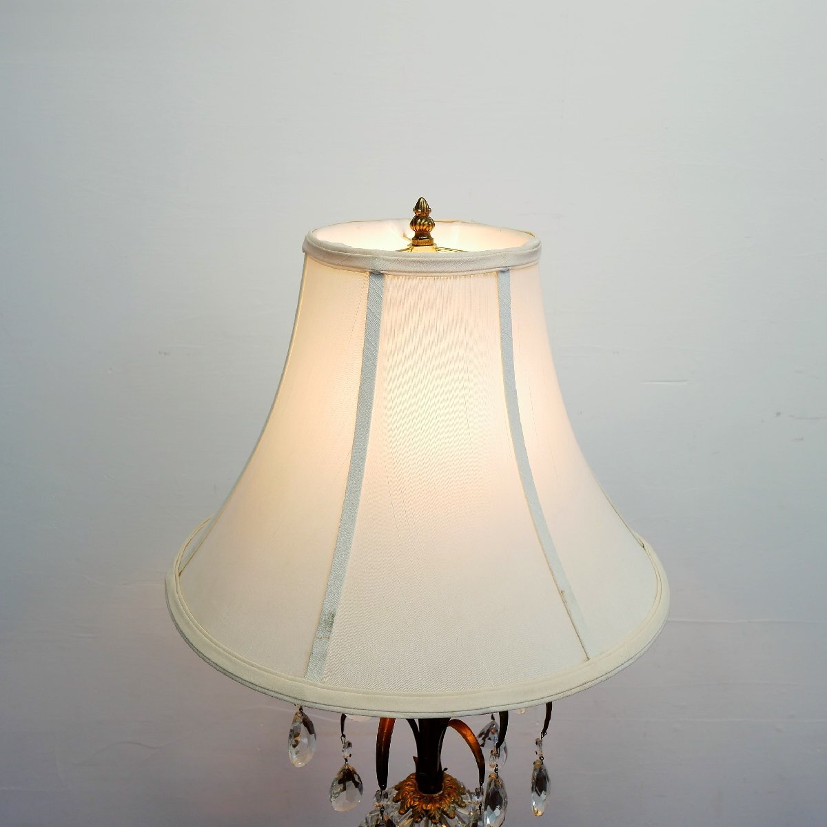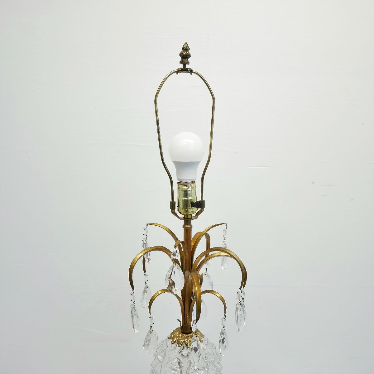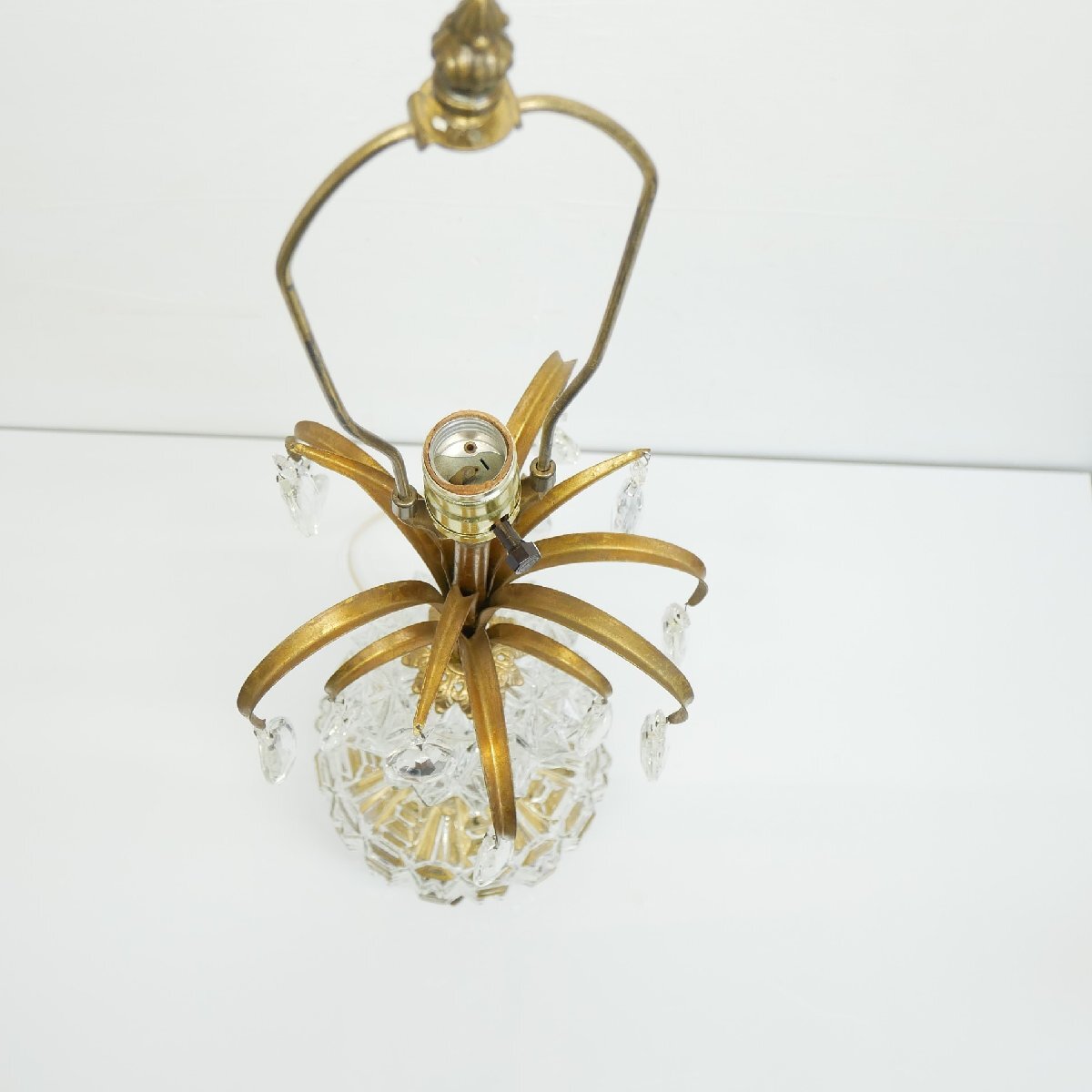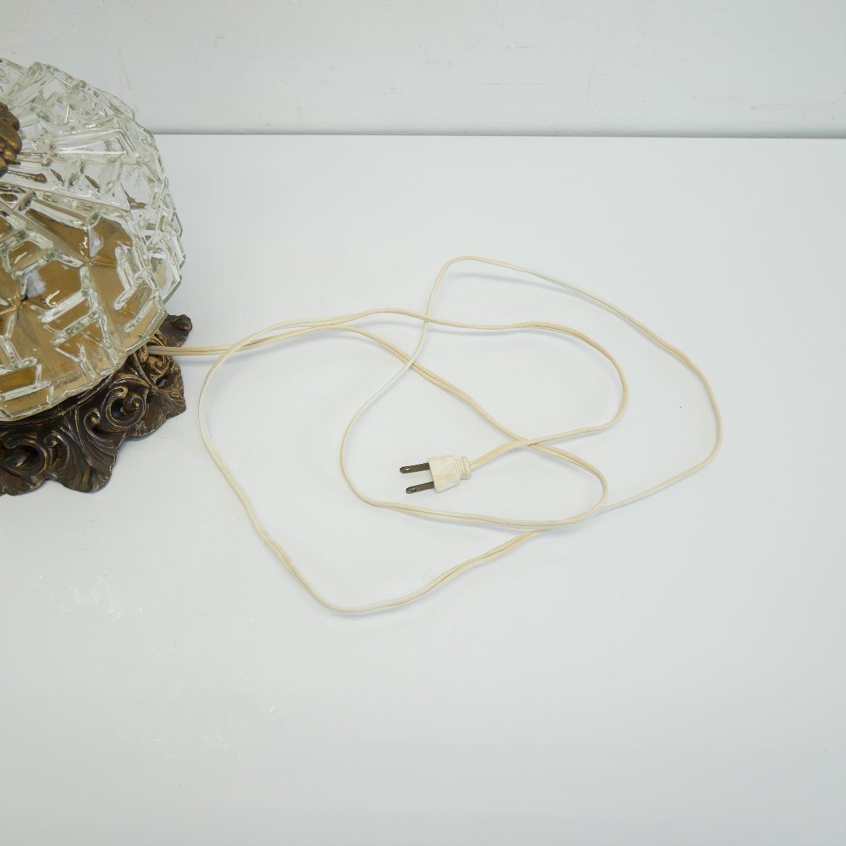 | 商品説明 explanation | 1970年代頃のテーブルランプです。 上下2灯 クリアガラスのカッティングが美しく、シャンデリアパーツ付きで、点灯するとさらに素敵です。 お部屋のインテリアなどにいかがでしょうか。 ※上はLED電球、下はナツメ球を使用しています。どちらも日本で市販されている電球です。 ※スイッチを右回しで、上下切り替え、両方、ON,OFFに替えられます。 ※シェードは布製で、台座と支柱は金属(鋳物)です。 |