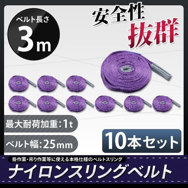【送料無料】1t 3m ナイロンスリングベルト3m×1000kg×25mm ★荷揚げ 吊り上げ 吊り下げ 玉掛け運搬に!◆10本セット◆