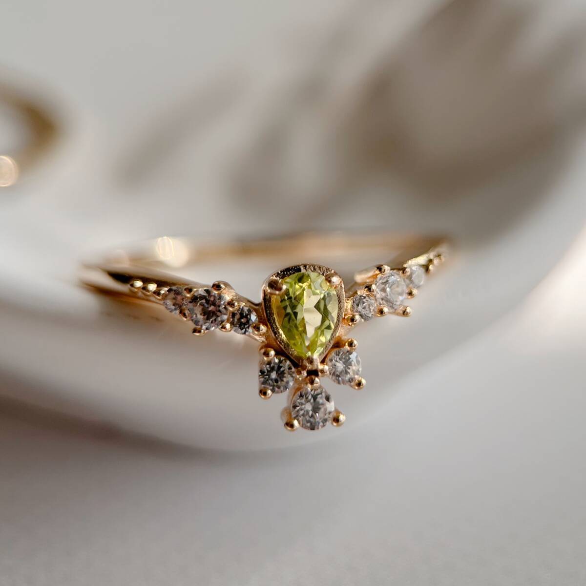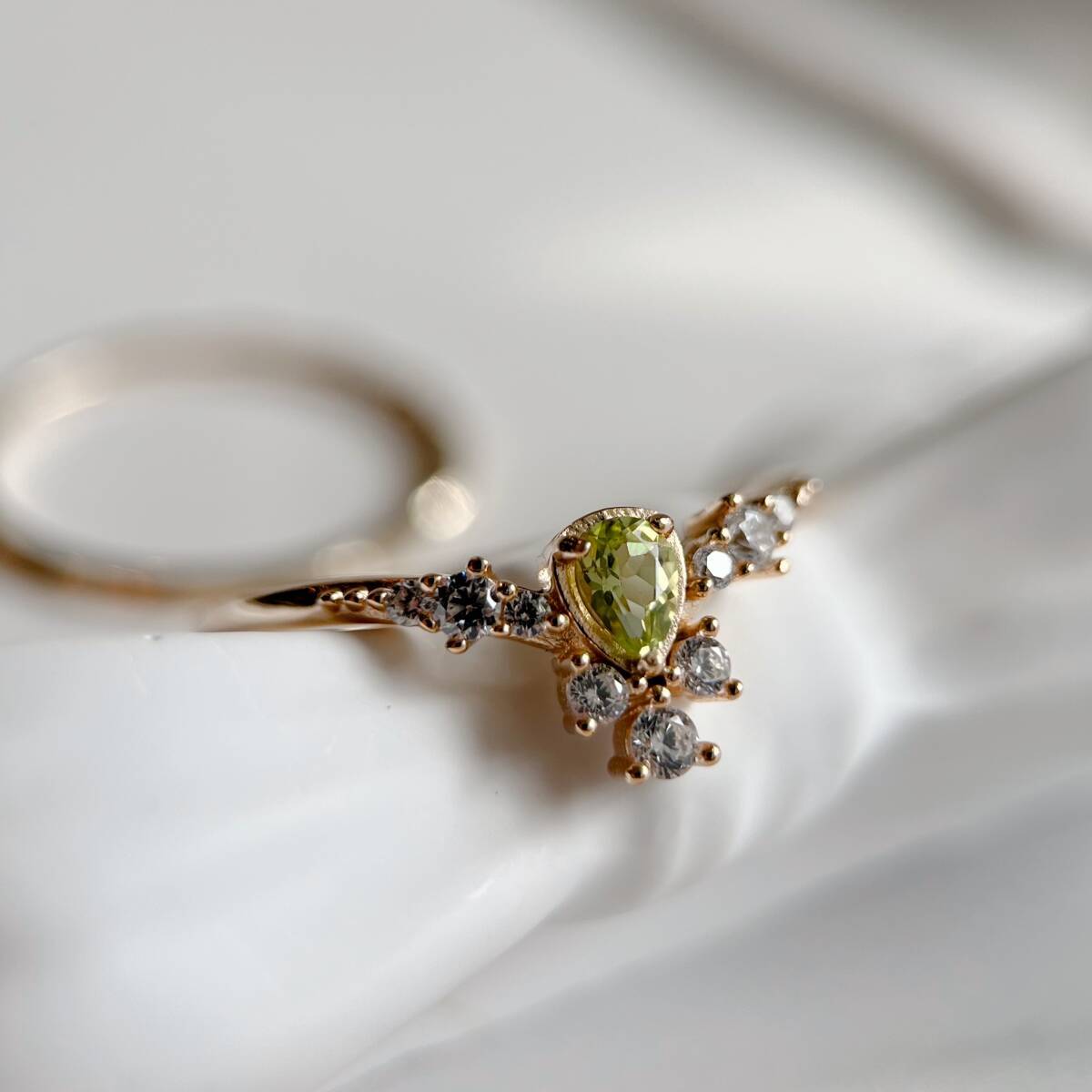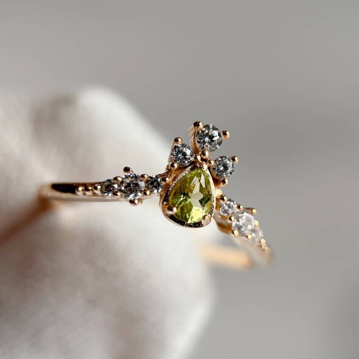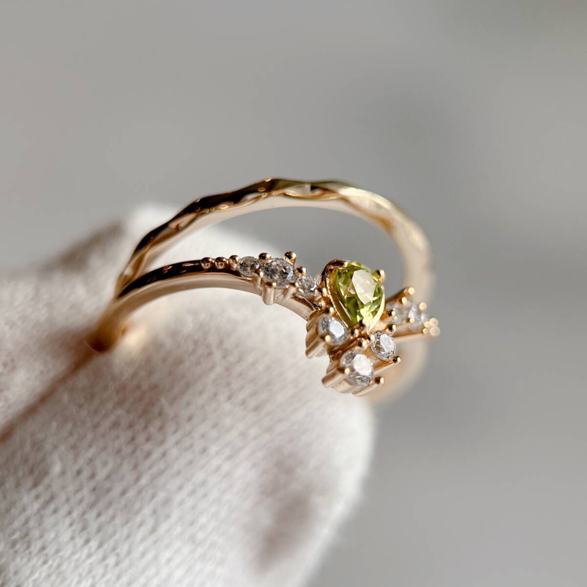 ドロップ型にカットされたの天然ペリドットを使ったリング。