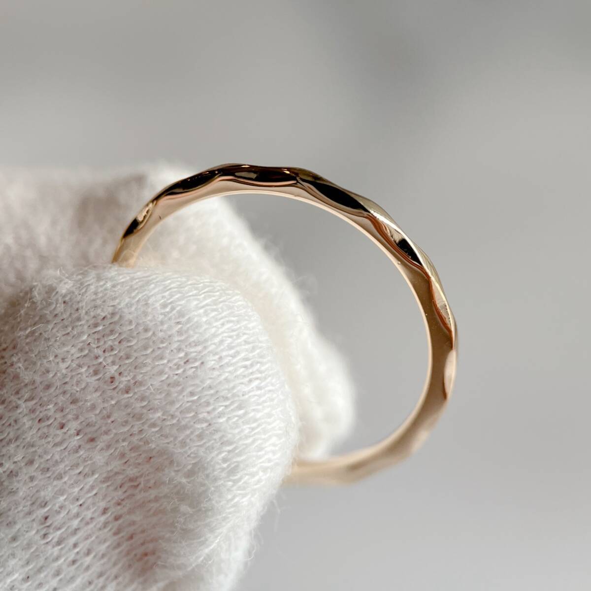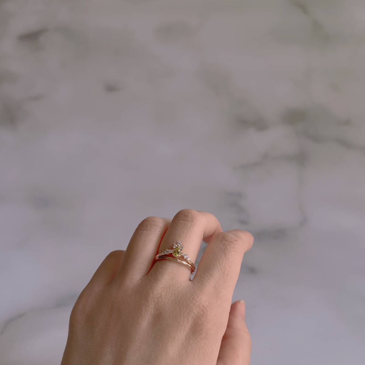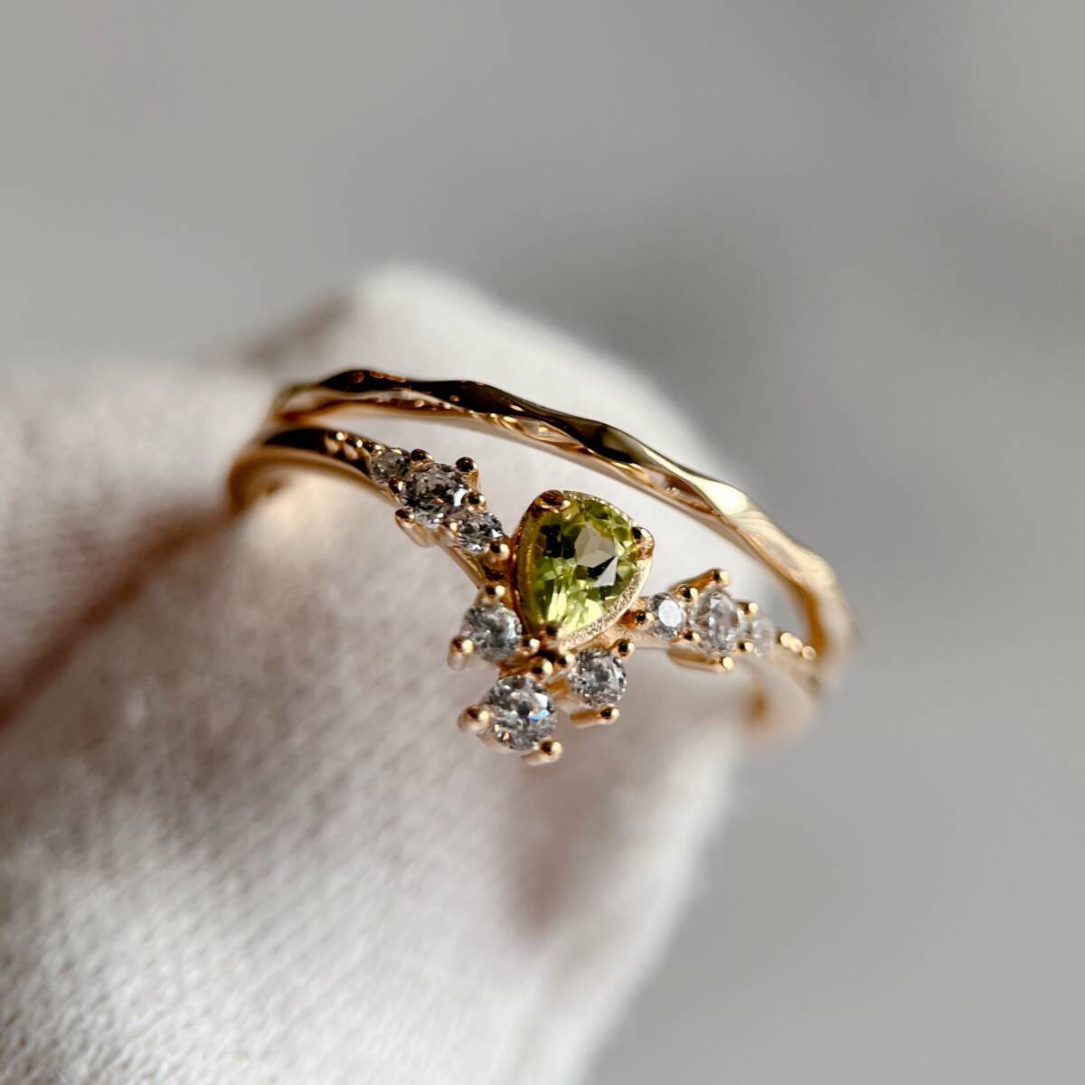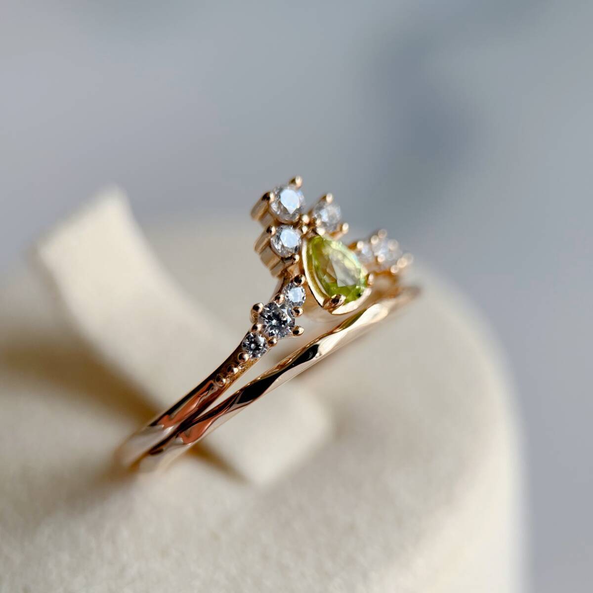 ドロップ型にカットされたの天然ペリドットを使ったリング。