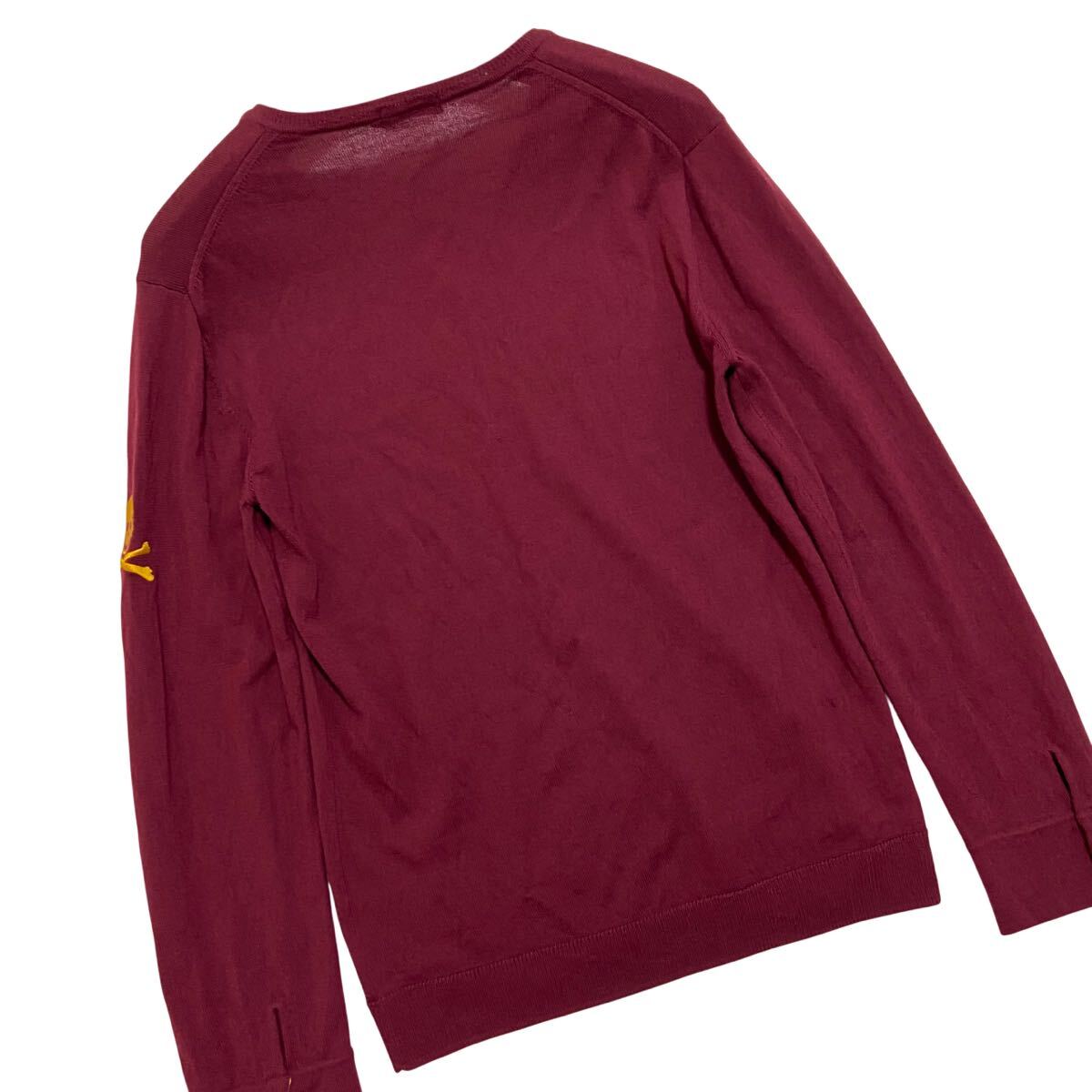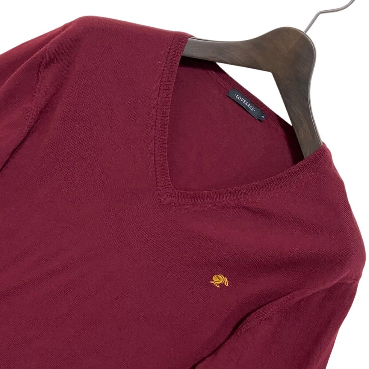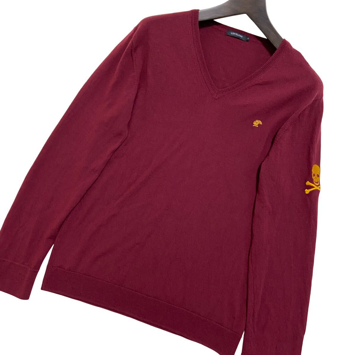 ラブレスのメンズハイゲージウールニット。完売品。選び抜かれたイタリア製糸を贅沢に。ストレッチ性を備えたハイゲージウールが身体を優しくホールド。ハンサムなVネックとドクロモチーフも魅力。袖元のスイッチイエローのコントラスト。ボディラインを美しく表現する考え抜かれたシルエット。クリエイティビティとクラシックエレガンスの融合。カラーはワイン系。三陽商会取扱い国内正規品。