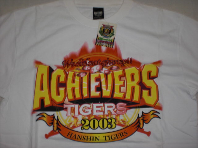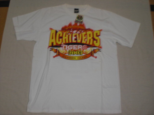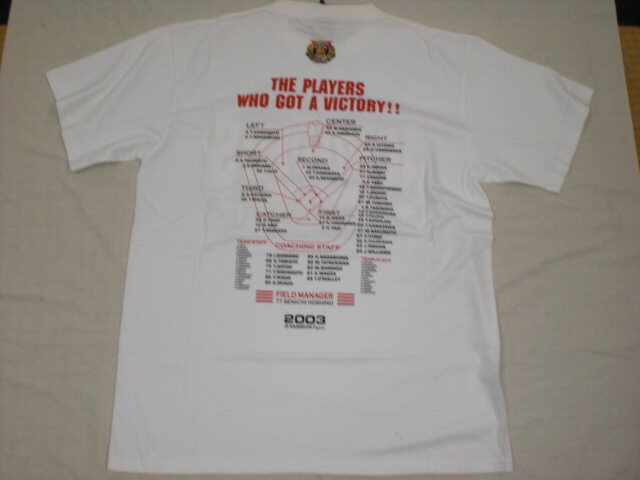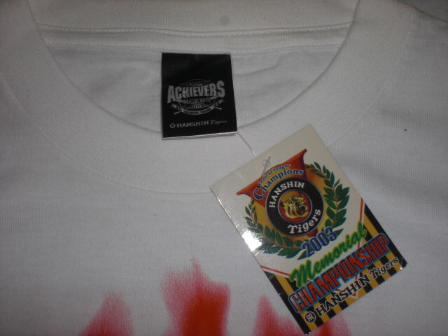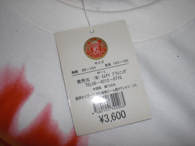 2025ペナントレースを制した阪神タイガースの2003年セリーグ優勝記念ビール掛けTシャツ。中国製。綿100%。サイズM-L(着丈70㎝、身幅55㎝)。未使用タグ付きです。当時の定価3600円。