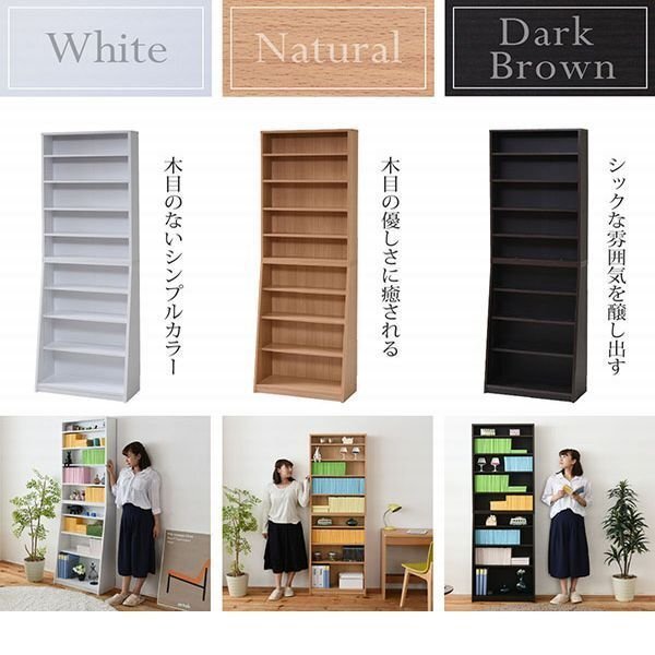 【カラー】 ホワイト、ナチュラル、ダークブラウン 【サイズ】 <外寸> 幅60×奥行28×高さ180cm <内寸> オープン部上部:幅56×奥行14.5×高さ86cm オープン部下部:幅56×奥行14.5~25×高さ82.5cm 可動棚小:幅56×奥行14×厚み1.5cm(1cmピッチ上段63穴、下段31穴) 可動棚大:幅56×奥行17×厚み1.5cm(1cmピッチ40穴) 【材質】 本体:プリント紙化粧繊維板 【耐荷重】 可動棚:(約)5kg以下 【収納量】 文庫本:(約)333冊、コミック:(約)296冊 DVD:(約)296枚、CD:(約)504枚、Blu-ray:(約)344枚 【生産国】 中国 【梱包】 2梱包でお届けします。 2-1 サイズ:91×31.5×12.5cm、重量:11kg 2-2 サイズ:89×19×17cm、重量:9.3kg 【その他】 可動棚:小×5枚、大×2枚 【組み立て品】 お客様による組み立てが必要です。 |