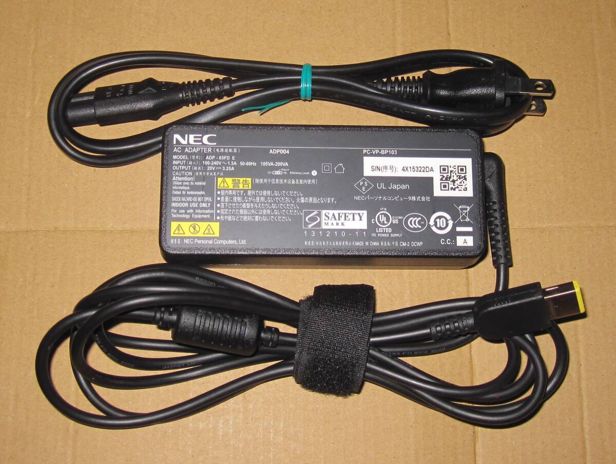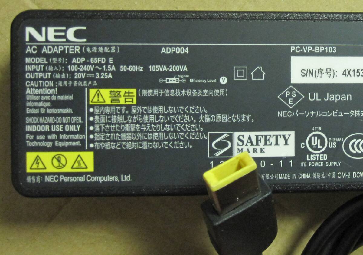 NEC PC用純正ACアダプタ PC-VP-BP103 (20V 3.25A) 11mm×4.5mm 角型