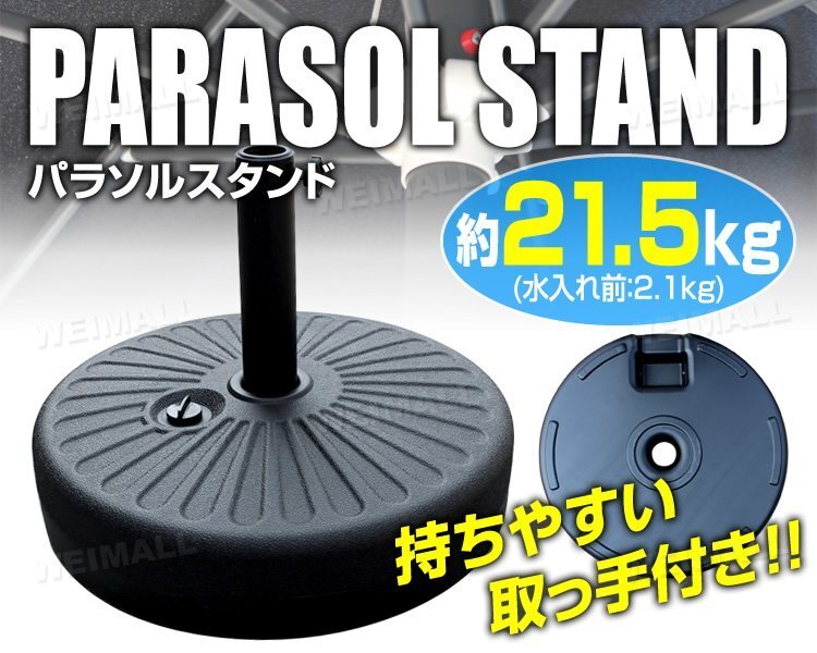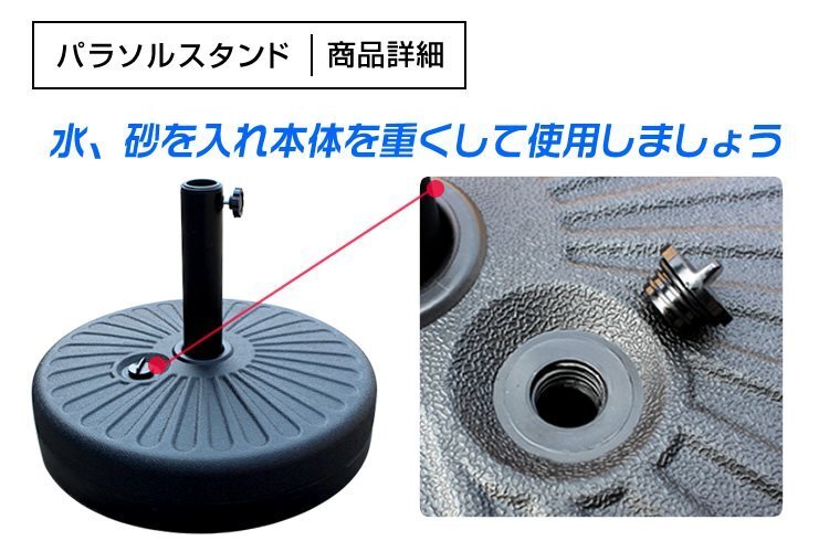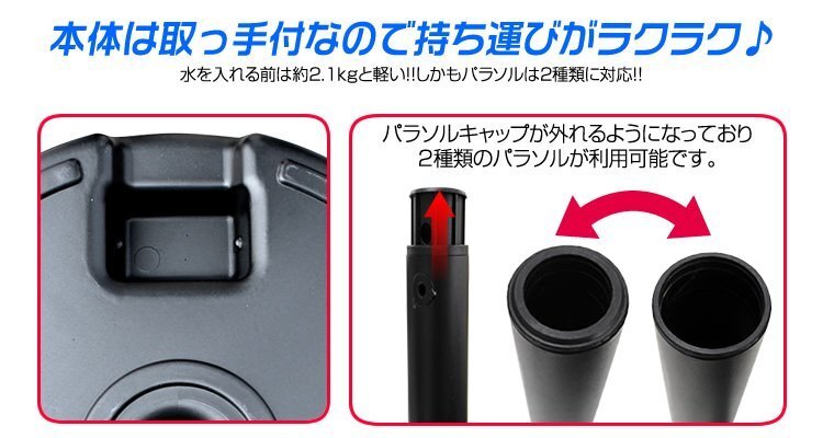 パラソルベース 注水式 中に水を入れて使用するパラソルベーススタンド。 ガーデンやベランダでのパラソルの使用でオススメ! 使用後は中の水を抜けば軽くなるので持ち運びにも便利です。 本体は取っ手付きなので持ち運びがラクラク! ポール受けキャップは本体に収納できます。 パラソルスタンド以外にも、のぼり等のスタンドに最適! |