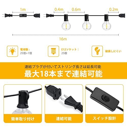連結可能:ストリング長さは15mで、スイッチの延長コード長は1mで、点灯と消灯が便利である。電球の間隔は60cmです。連結プラグが付いてストリング長さは延長可能できます。最大18本まで連結可能。