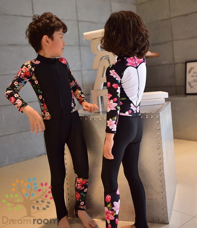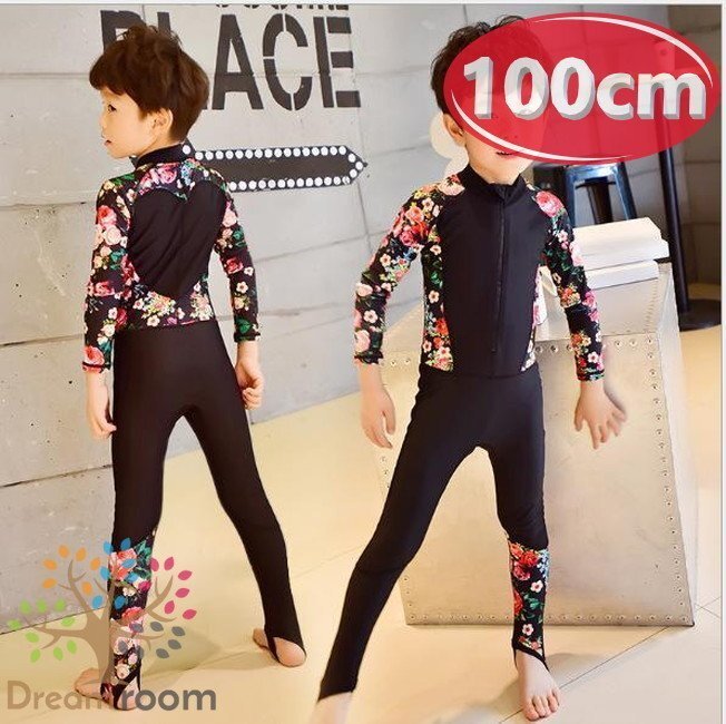 1スタ☆kids 2点セット フラワー 花柄 ブラック ラッシュガード+海水パンツ セットアップ男女兼用 【100cm】 K-244 スイムウェアー