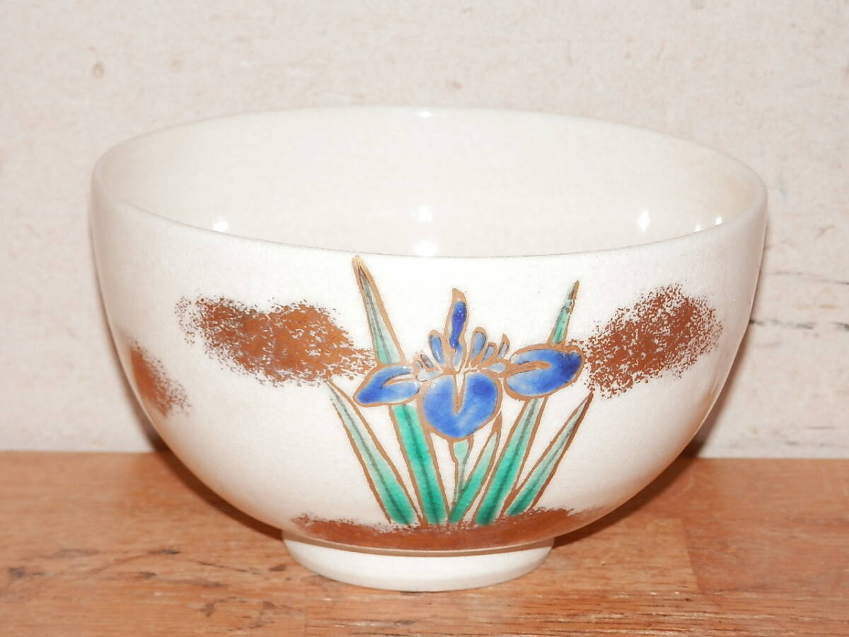 横田鳳山造 菖蒲図 茶碗 京焼 箱なし 在銘 茶道具 陶器
