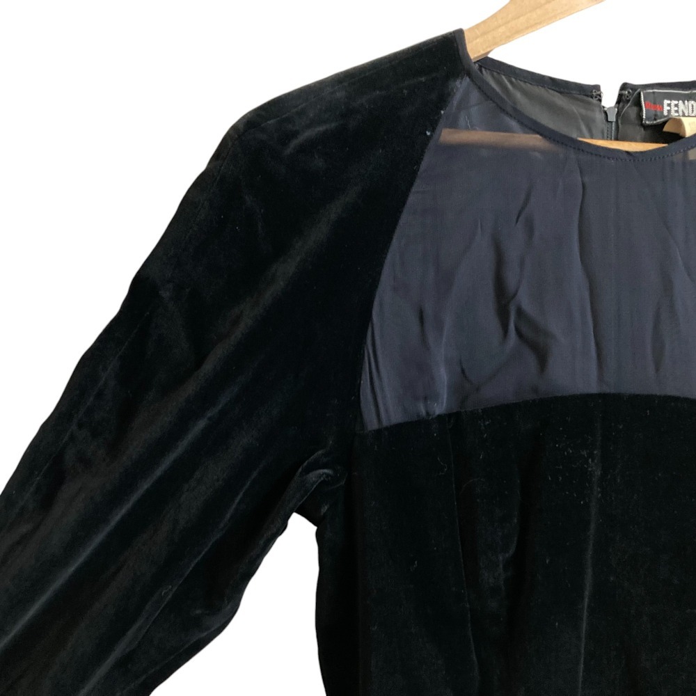 美品 FENDI 365 by CONTIR フェンディ ヴィンテージ ベロアコンビ ドレス 長袖 ひざ丈 フレア ワンピース サイズ42 ブラック