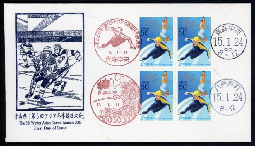 0949 【FDC】ふるさと 秋田県「第5回アジア冬季競技大会」[青森中央、八戸荒町/15.1.24/鳴美版](解説書なし)
