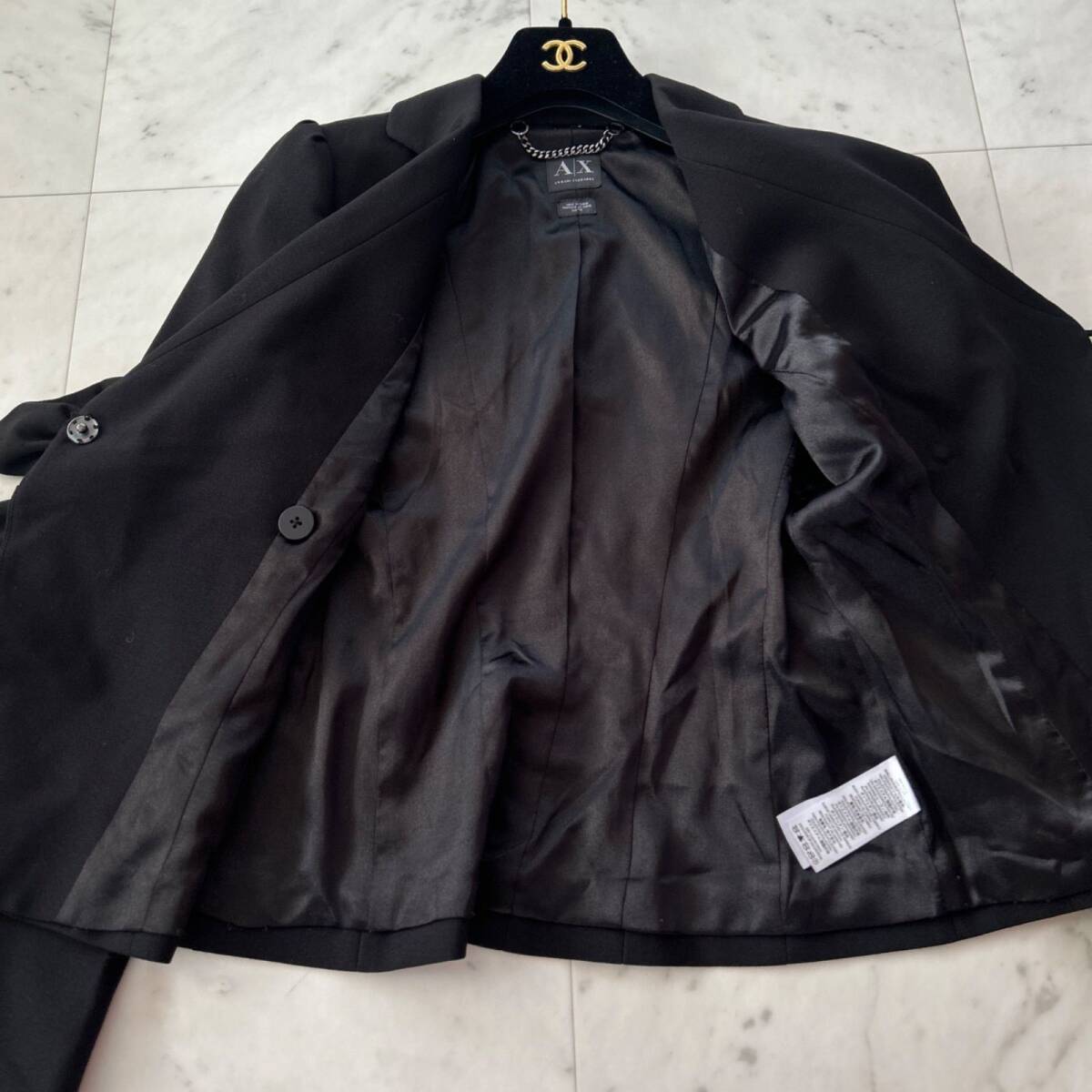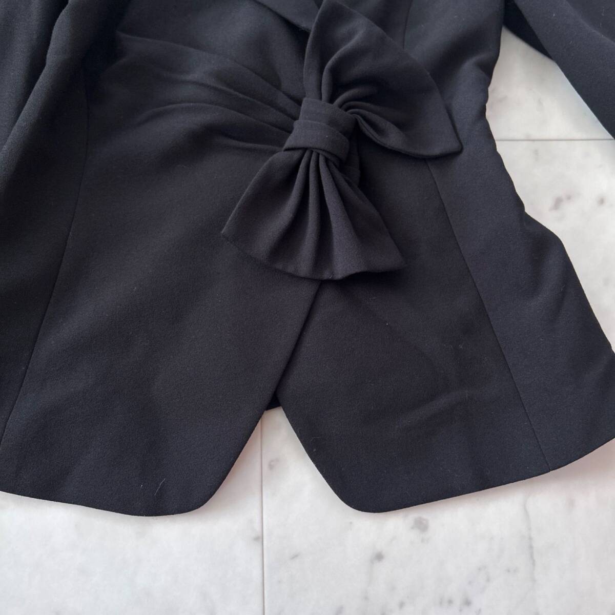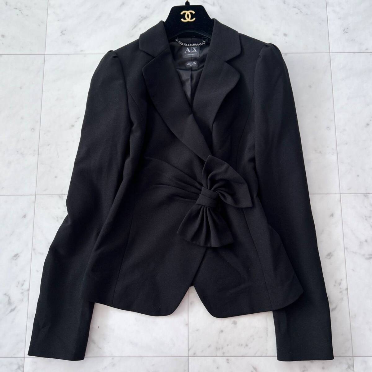 アルマーニエクスチェンジらしい洗練された雰囲気を持つ、ブラックジャケットです。ウエスト部分に大きなリボンがあしらわれており、女性らしい華やかさとスタイルアップ効果を演出してくれます。ビジネスシーンやフォーマルな場面はもちろん、ドレスアップしたいシーンでも活躍する一着です。ベーシックなブラックカラーなので合わせやすく、一枚羽織るだけで全体の印象を格上げしてくれるアイテムです。