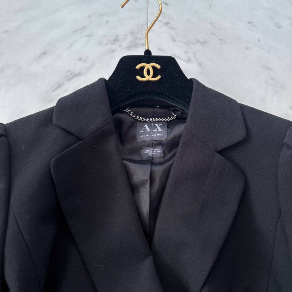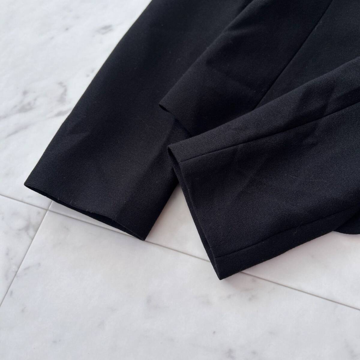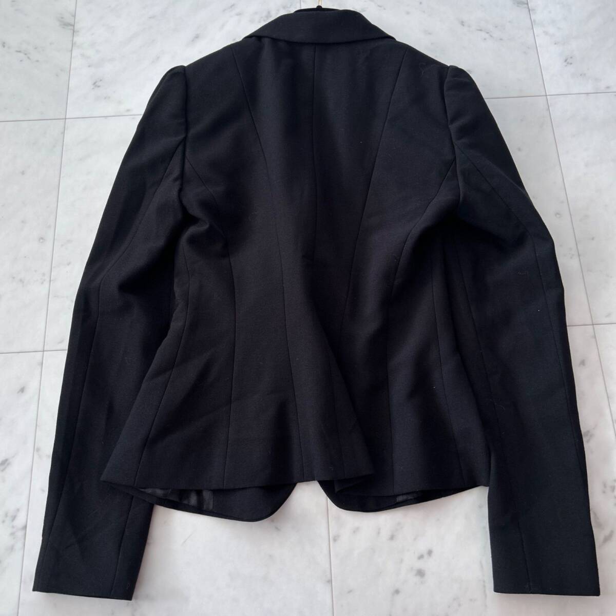 アルマーニエクスチェンジらしい洗練された雰囲気を持つ、ブラックジャケットです。ウエスト部分に大きなリボンがあしらわれており、女性らしい華やかさとスタイルアップ効果を演出してくれます。ビジネスシーンやフォーマルな場面はもちろん、ドレスアップしたいシーンでも活躍する一着です。ベーシックなブラックカラーなので合わせやすく、一枚羽織るだけで全体の印象を格上げしてくれるアイテムです。