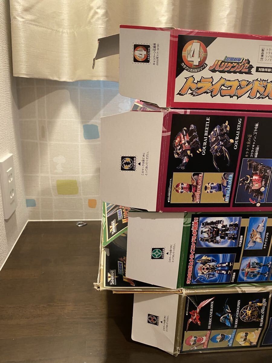 ・画像のように変形や合体は問題なく行えます。破損しやすいハリケンドルフィンのジョイントパーツにも破損見られません。説明書を見る限り欠品等は見られないかと思いますが、箱に破れあり、画像のようにハリケンレオンのジョイントパーツやハリケンドルフィンのパーツに一部欠けが見られます。