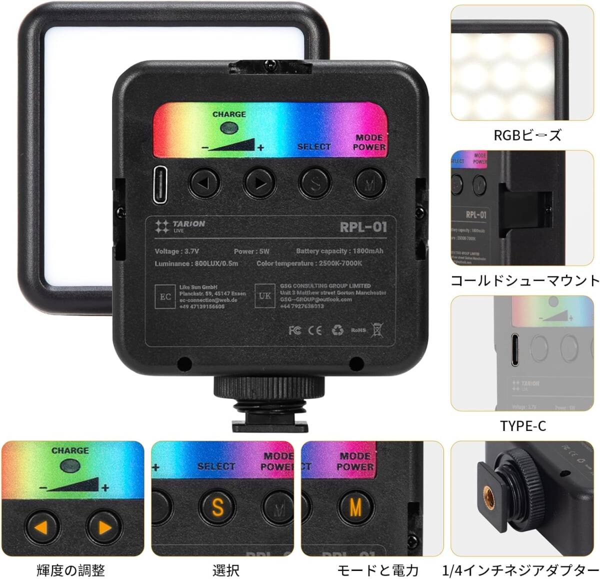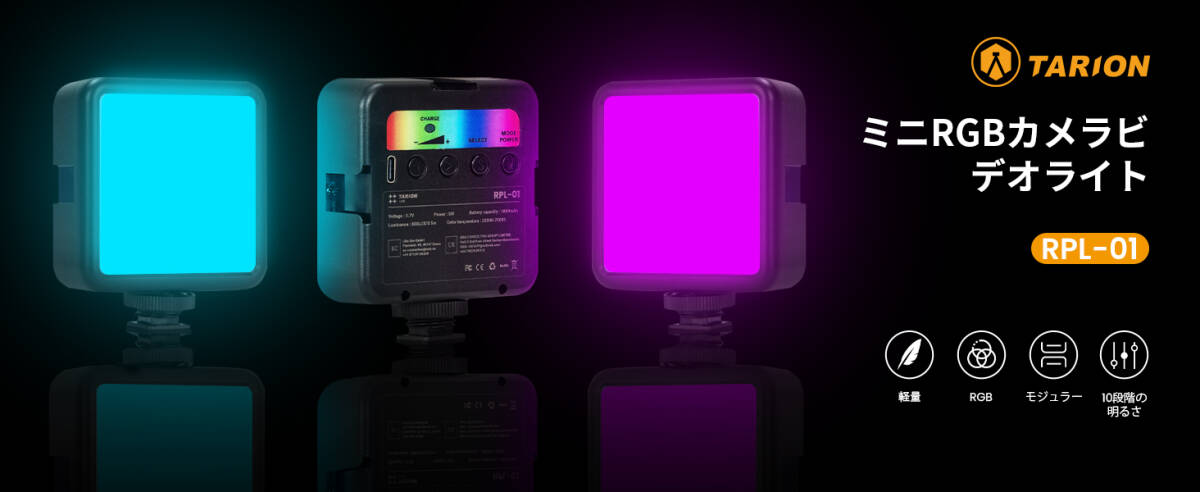 RGBライト Type-C 充電式 2500K-7000K 明るさ調整 デュアルカラーモード RPL-01