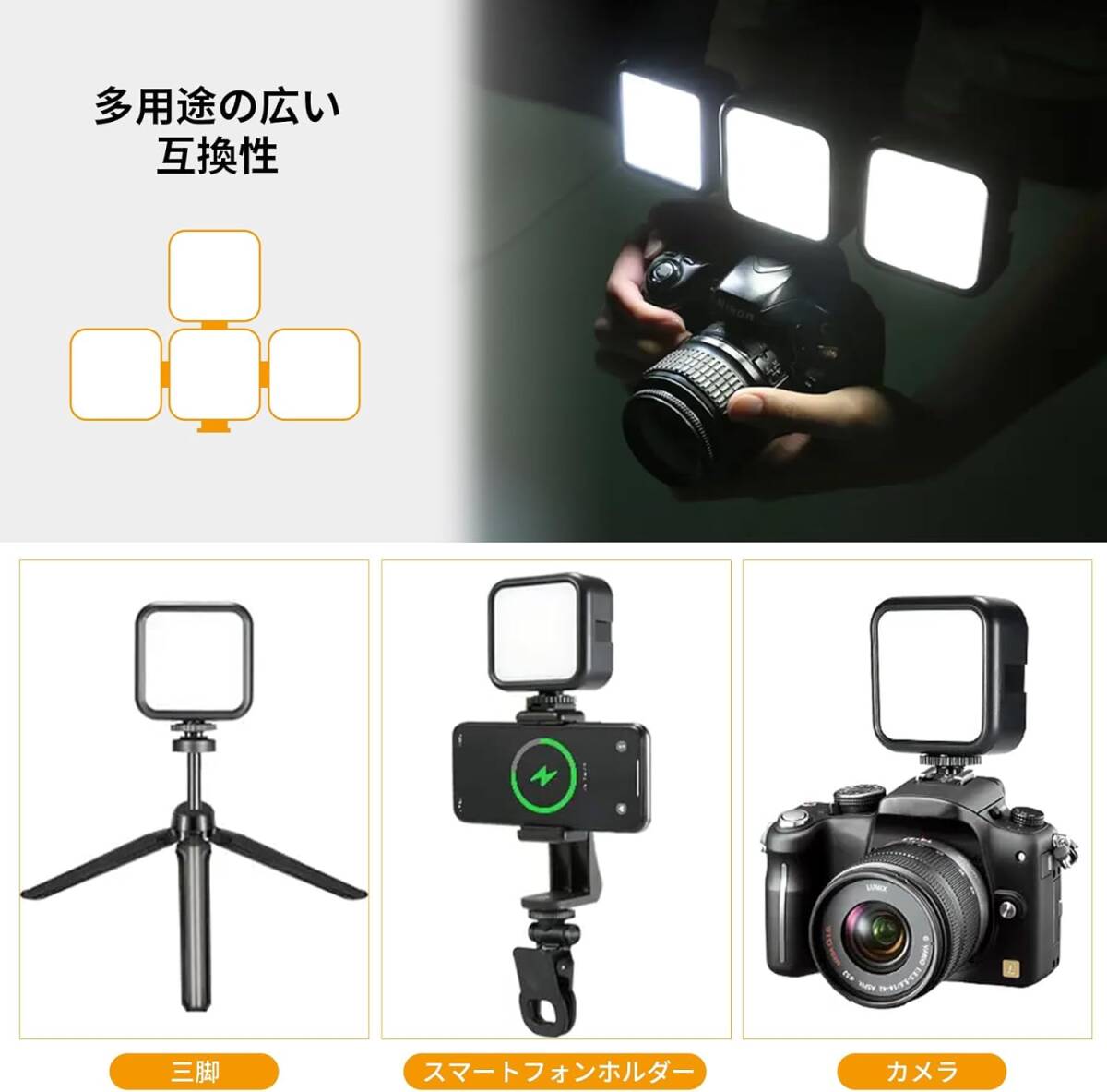 • 超軽量でポータブルなビデオライトで片手で簡単に操作でき、持ち運びに便利です。