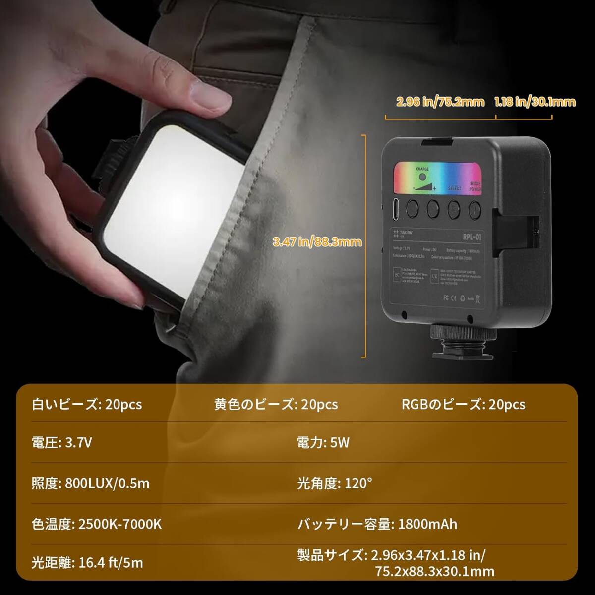 • 20個のRGB LEDビーズ、20個のクールホワイトLEDビーズ、20個のウォームホワイトLEDビーズが搭載されており、カラータンプの範囲は2500Kから7000Kまで自由に調整できます。