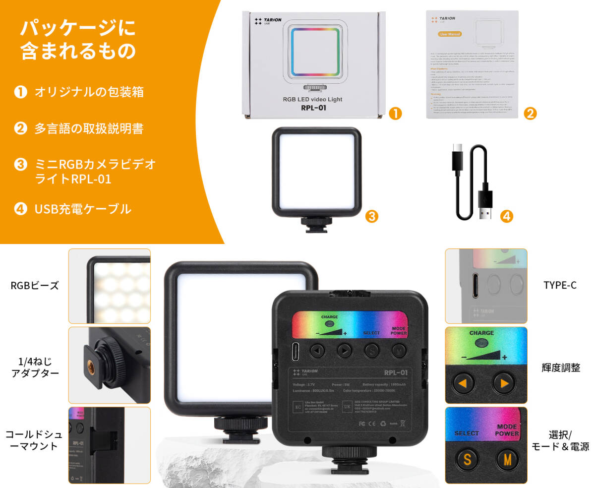 • RGBライト Type-C 充電式 2500K-7000K 明るさ調整 デュアルカラーモード RPL-01