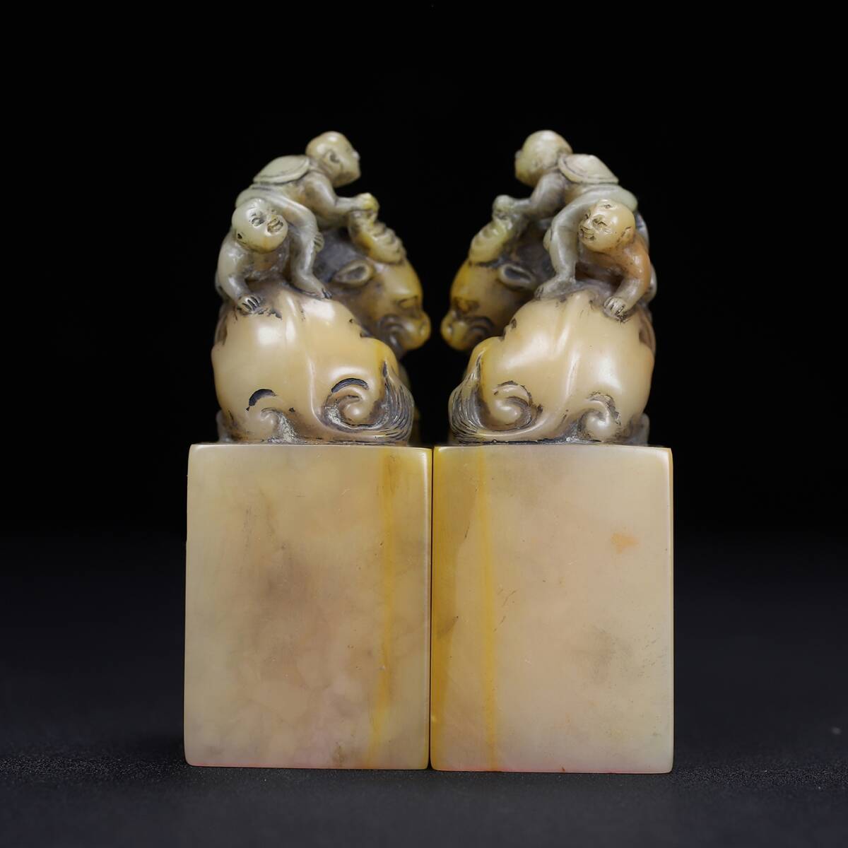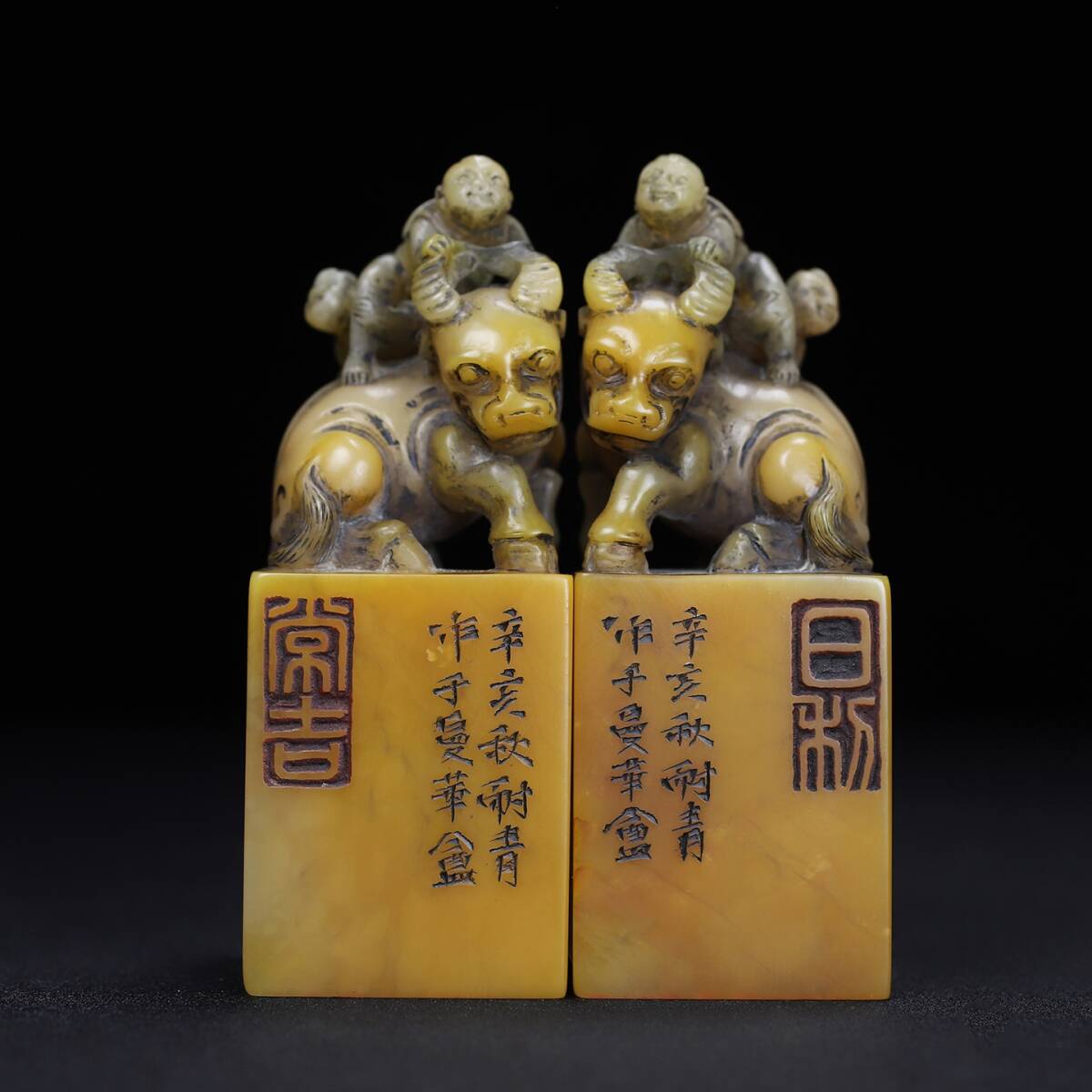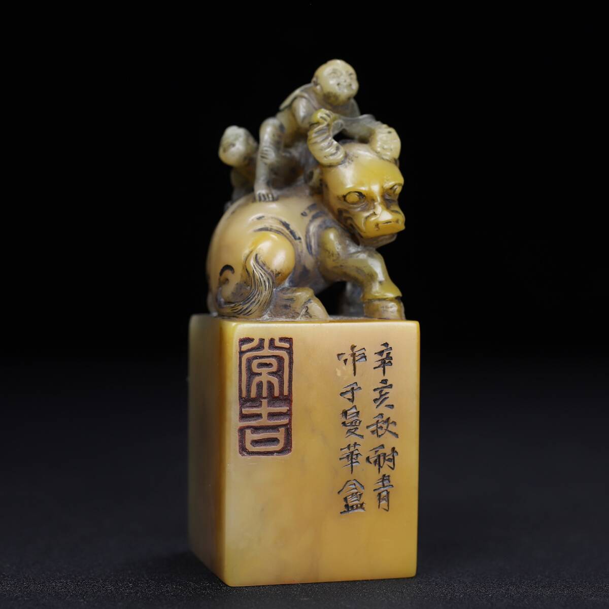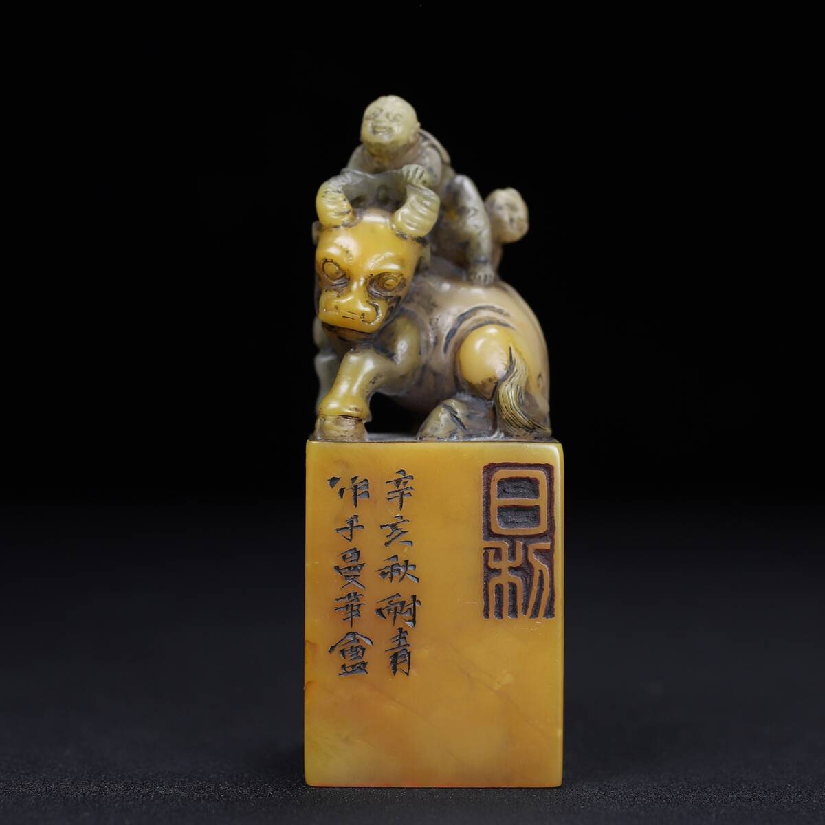 唐物 【清代篆刻家 銭松 号:耐青】寿山石 童子戲牛鈕 印章一套 天然石 手彫 篆刻 古印材 極細工 中国古玩 骨董品 古美味 D69