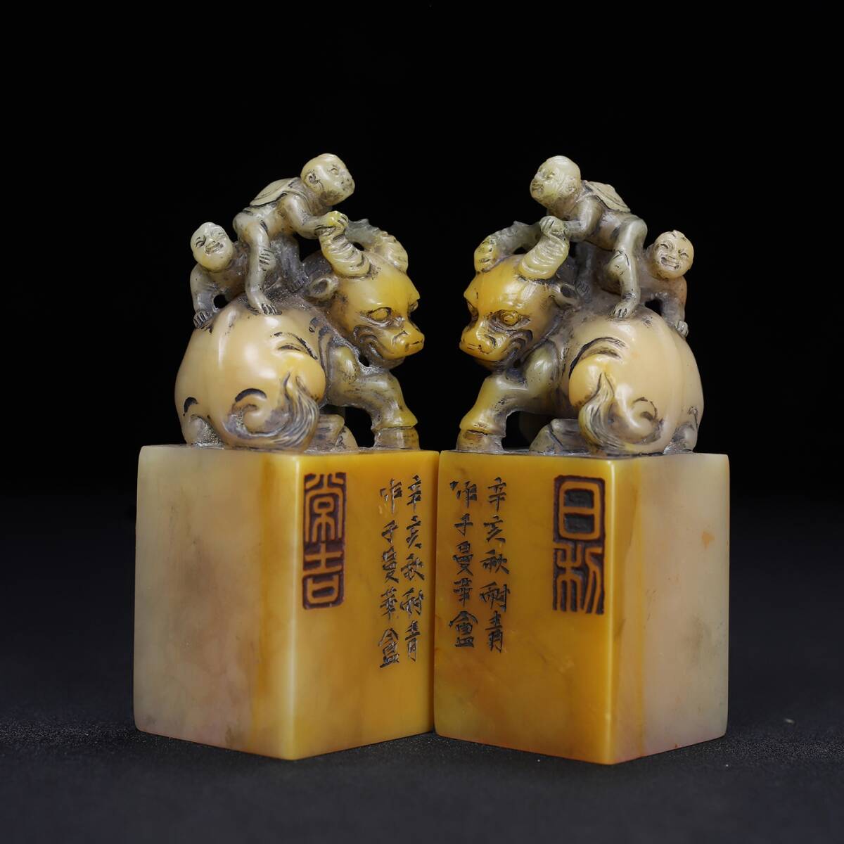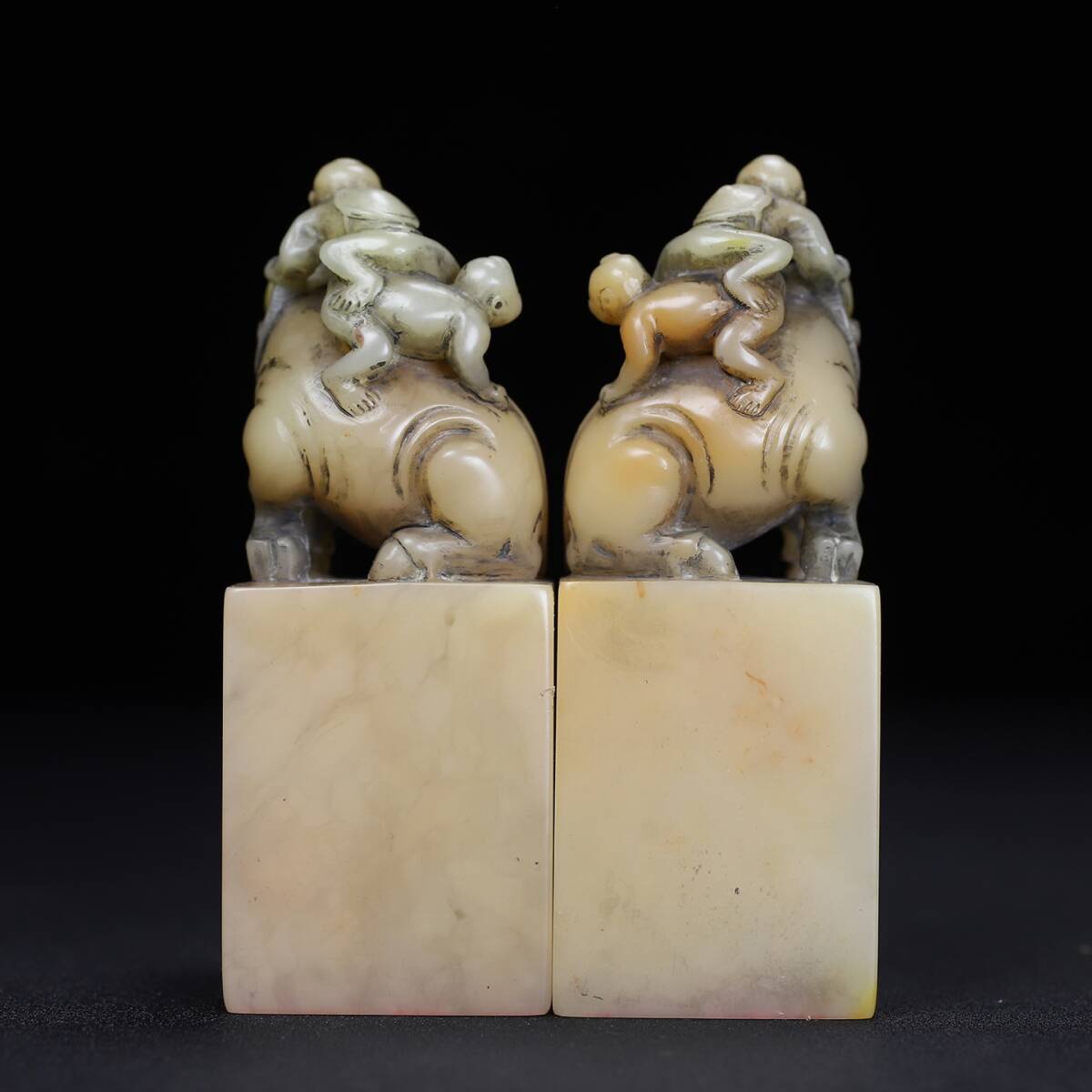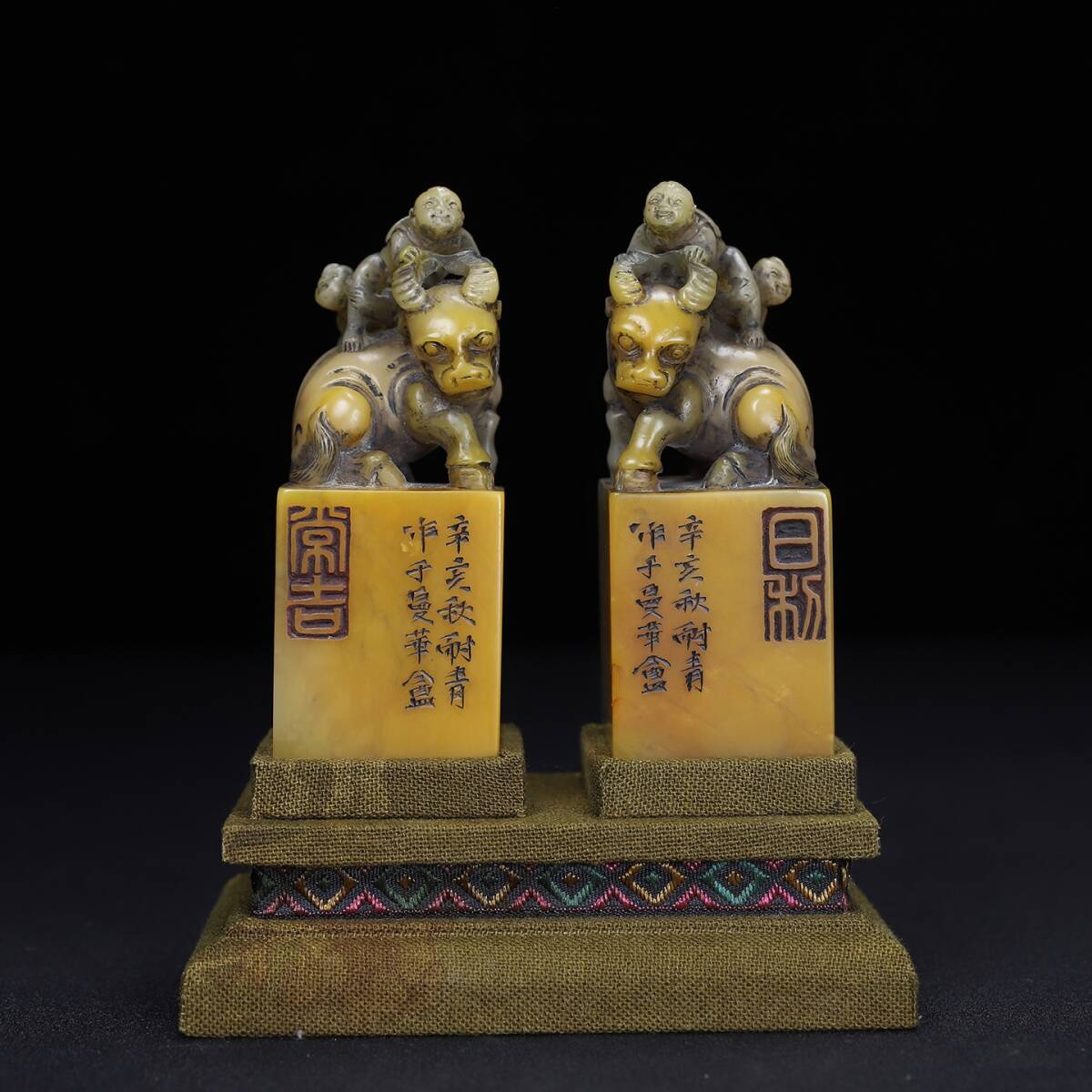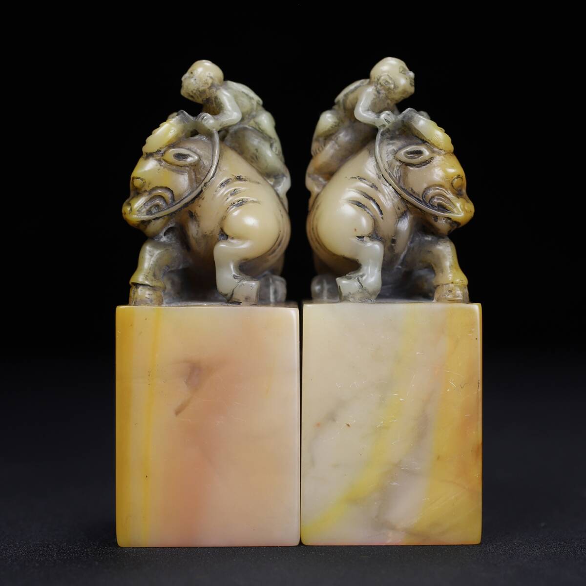唐物 【清代篆刻家 銭松 号:耐青】寿山石 童子戲牛鈕 印章一套 天然石 手彫 篆刻 古印材 極細工 中国古玩 骨董品 古美味 D69