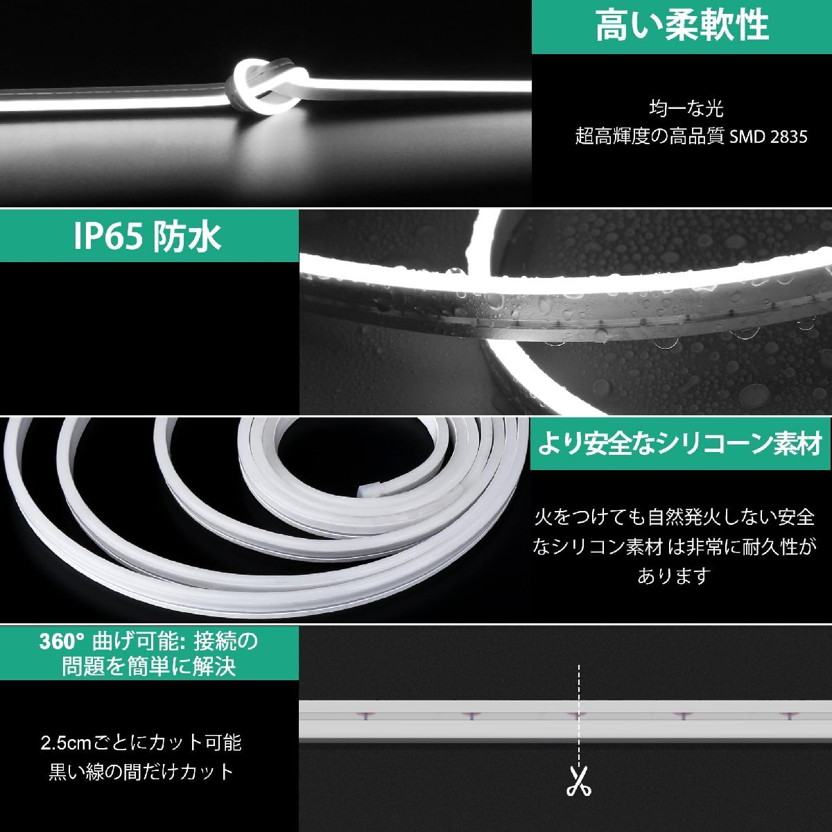 防水性と耐久性P65防水等級のLEDテープで、プールや雨の日でも安心して使用可能。耐熱性のあるシリコン素材を使用しており、LEDも長寿命で劣化しにくい設計です。