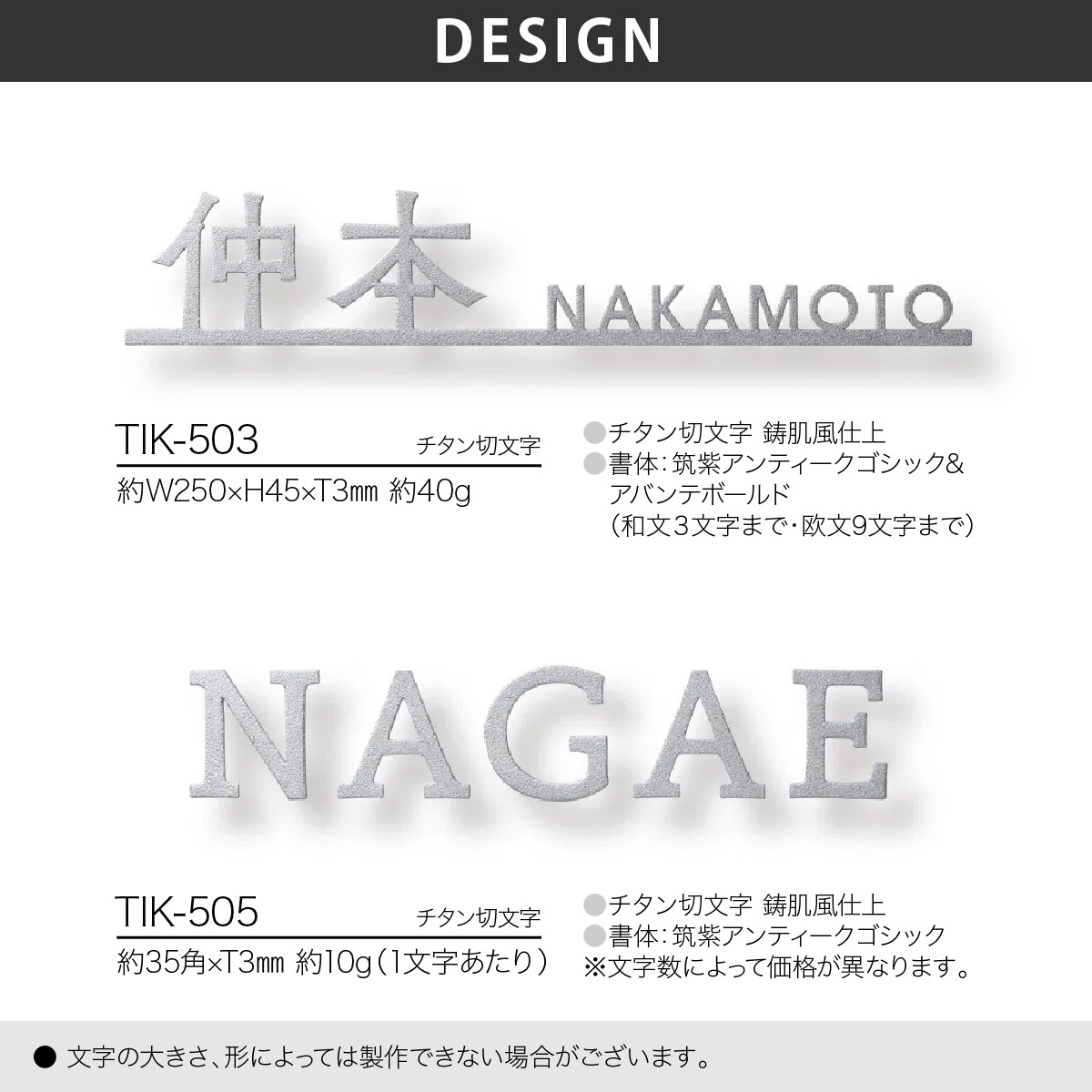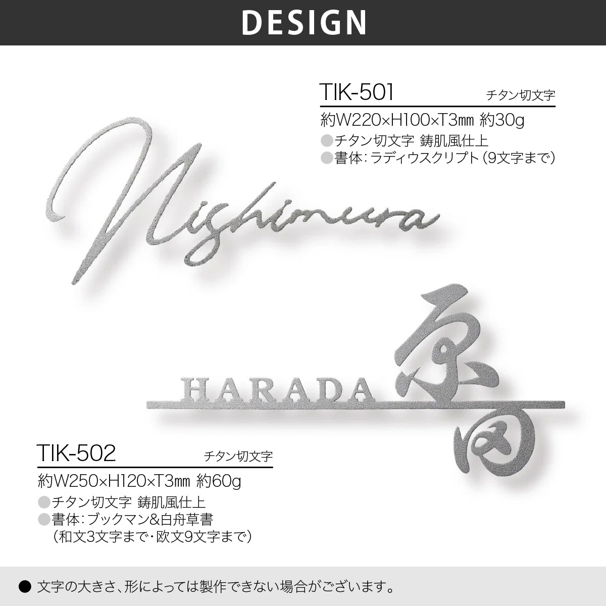商品サイズ | 【TIK-501】約220W×100H×3T(mm) 約30g 【TIK-502】約250W×120H×3T(mm) 約60g 【TIK-503】約250W×45H×3T(mm) 約40g 【TIK-505】約35角×3T(mm) 約10g(1文字あたり) |