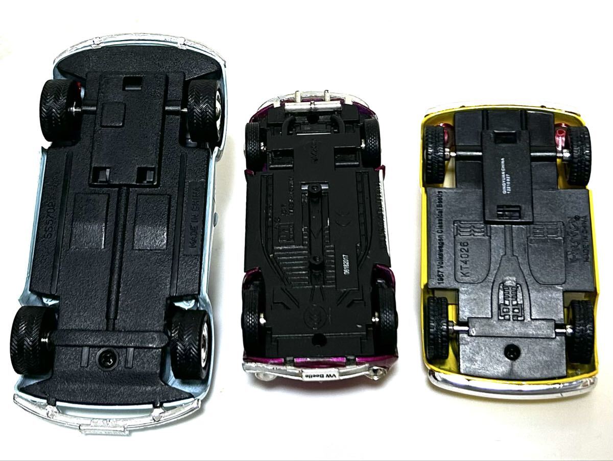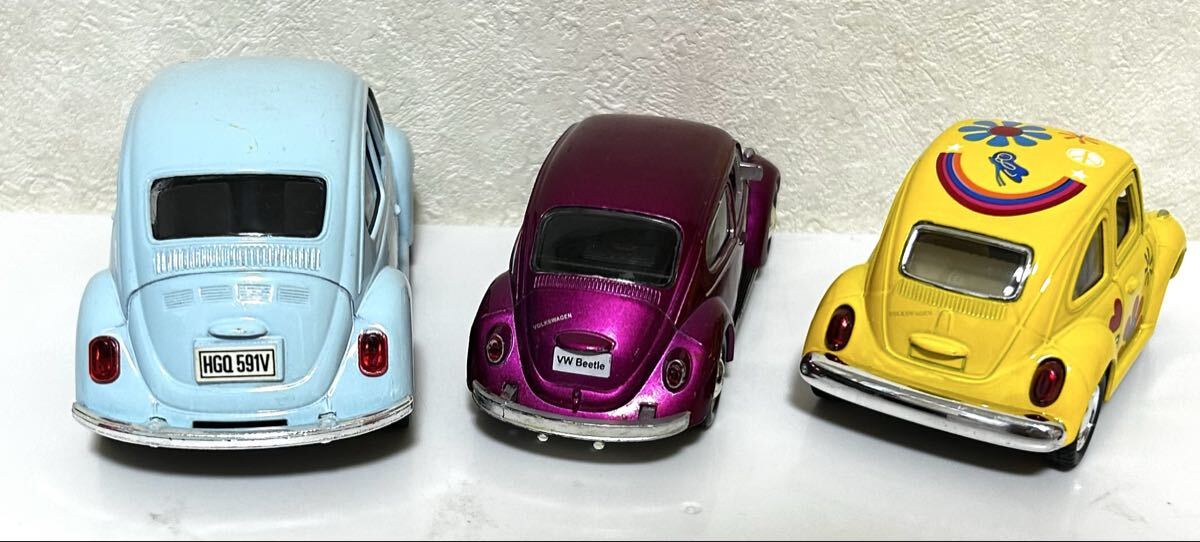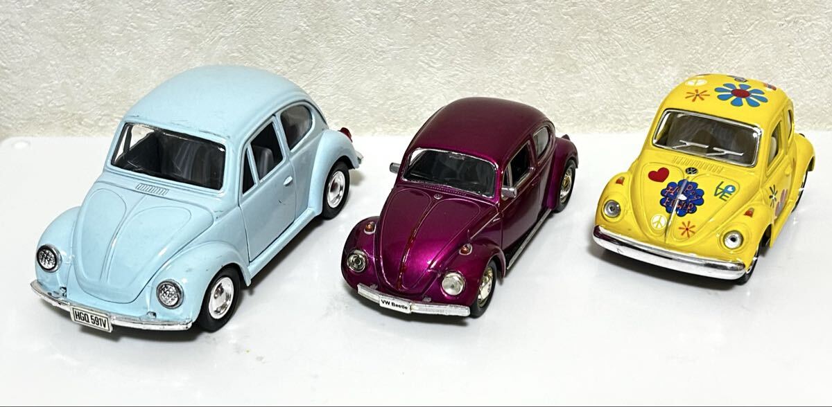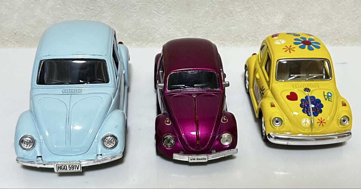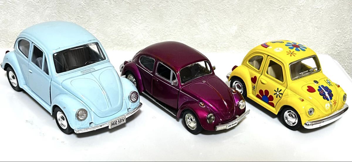 大きさは水色のVWは全長約13.5cm(メーカー不明)、赤色のVWは約12.5cm(RMZ)、黄色のフラワーVWは約10cm(KiNSFUN)です。水色と黄色はデフォルメがしてあり、ずん胴に仕上げてあります。赤のVWは前部のバンパー右端が欠けています。