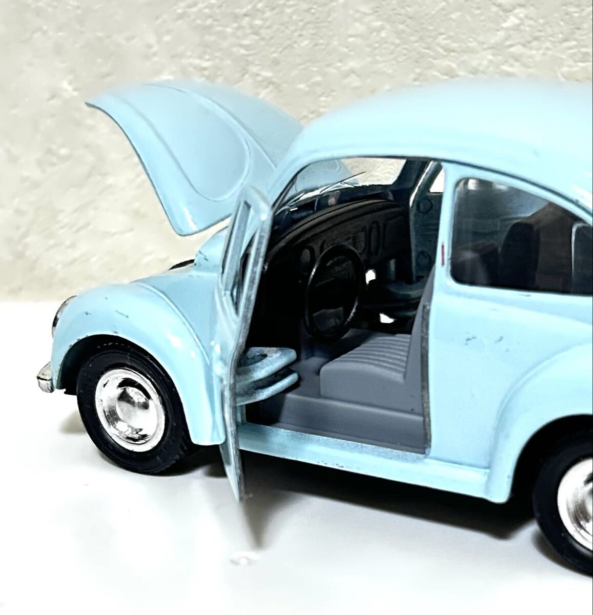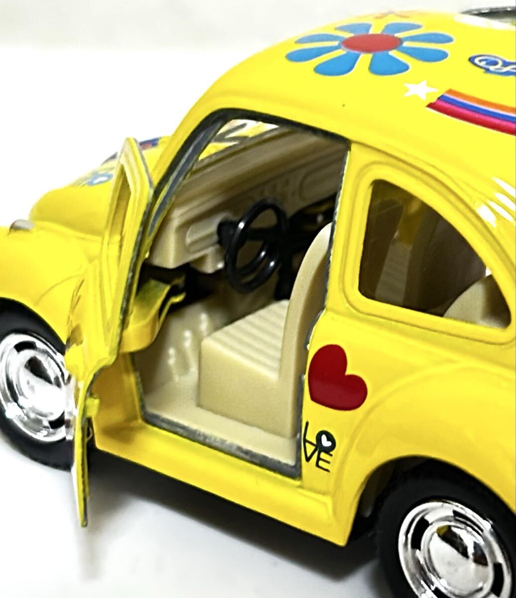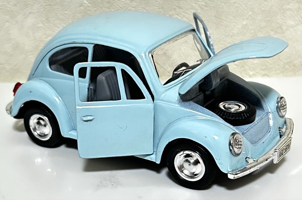 大きさは水色のVWは全長約13.5cm(メーカー不明)、赤色のVWは約12.5cm(RMZ)、黄色のフラワーVWは約10cm(KiNSFUN)です。水色と黄色はデフォルメがしてあり、ずん胴に仕上げてあります。赤のVWは前部のバンパー右端が欠けています。