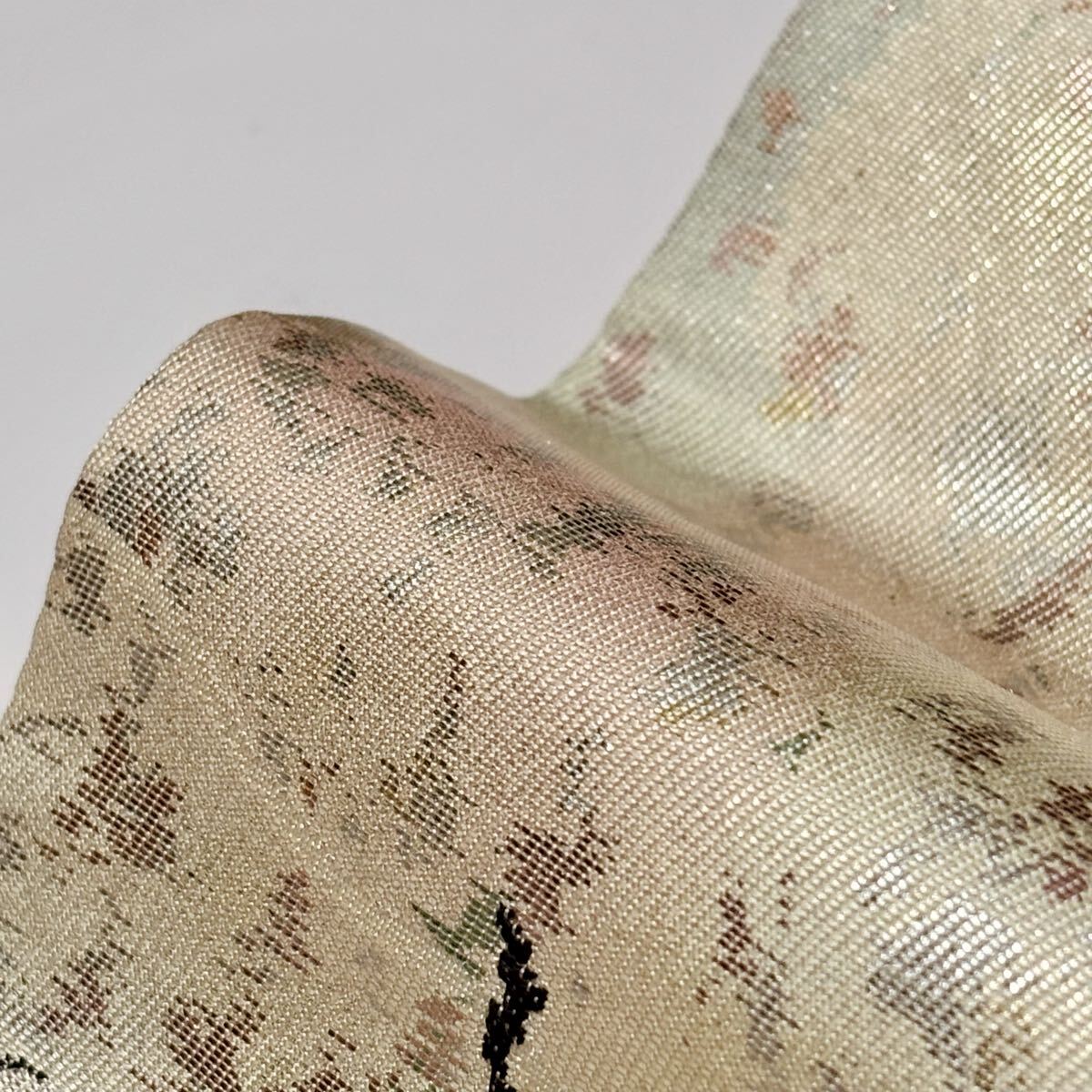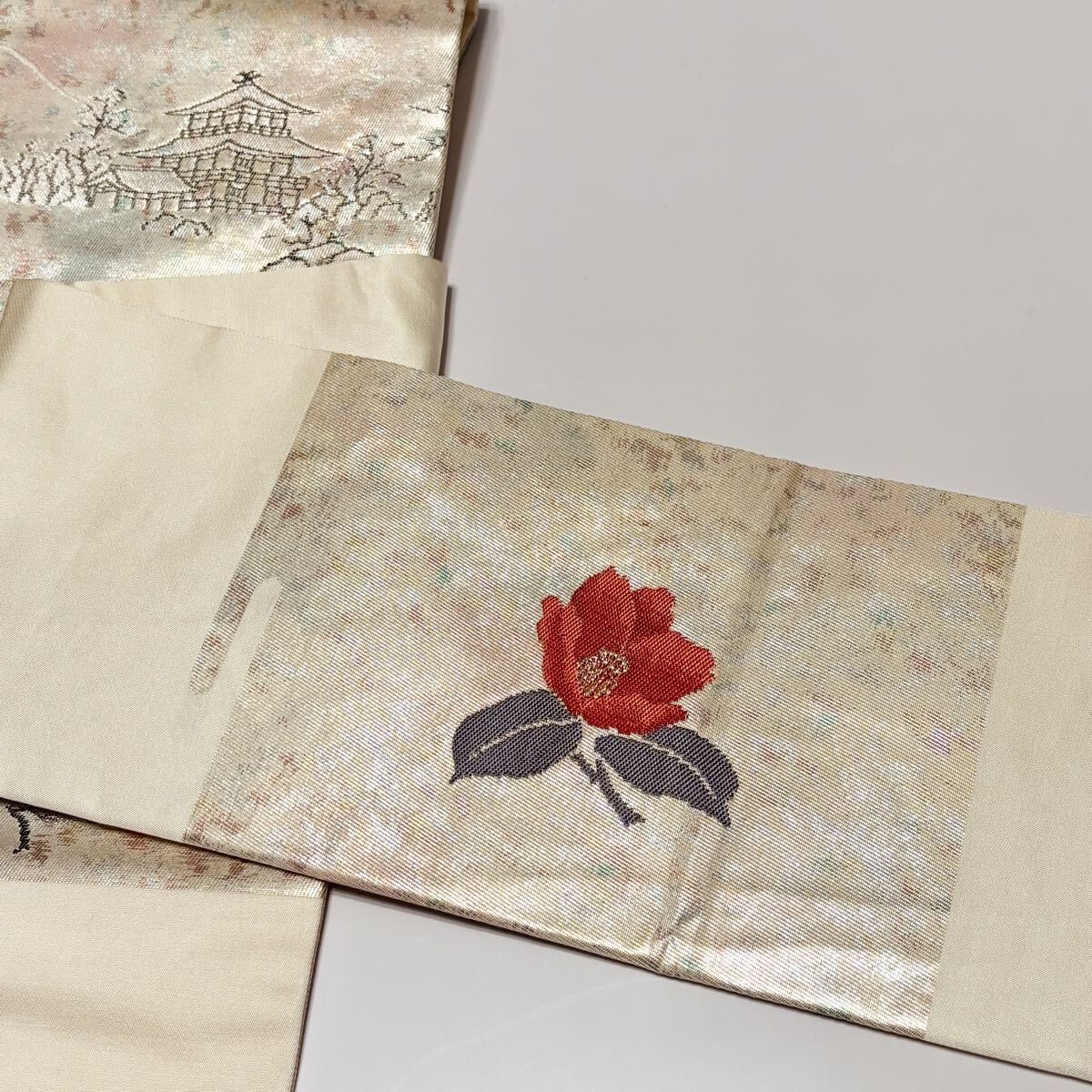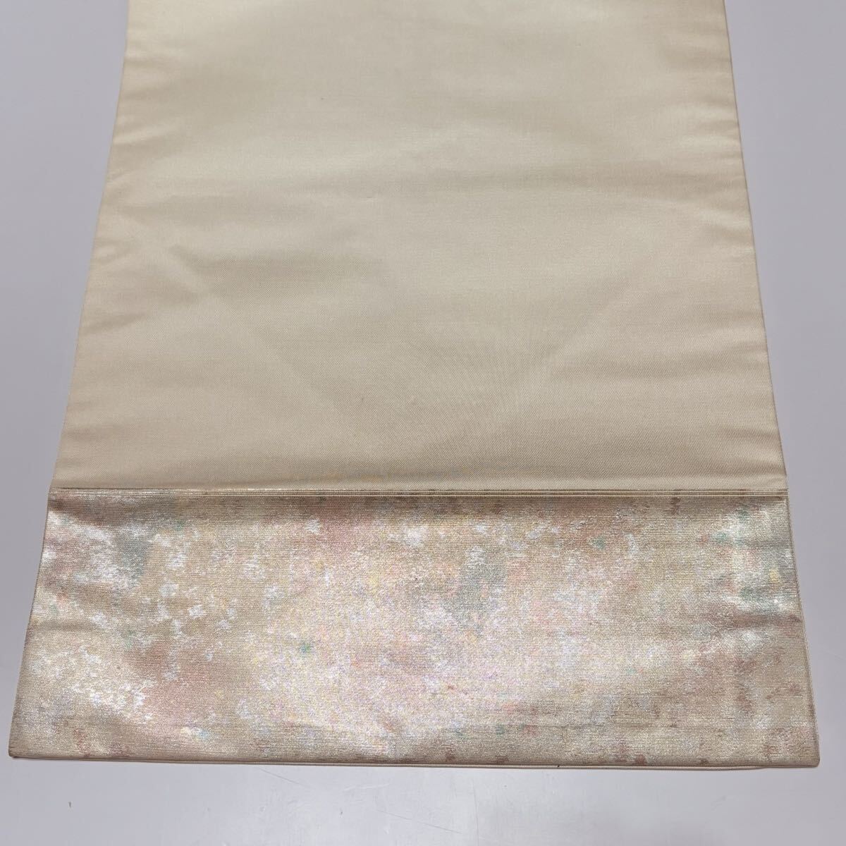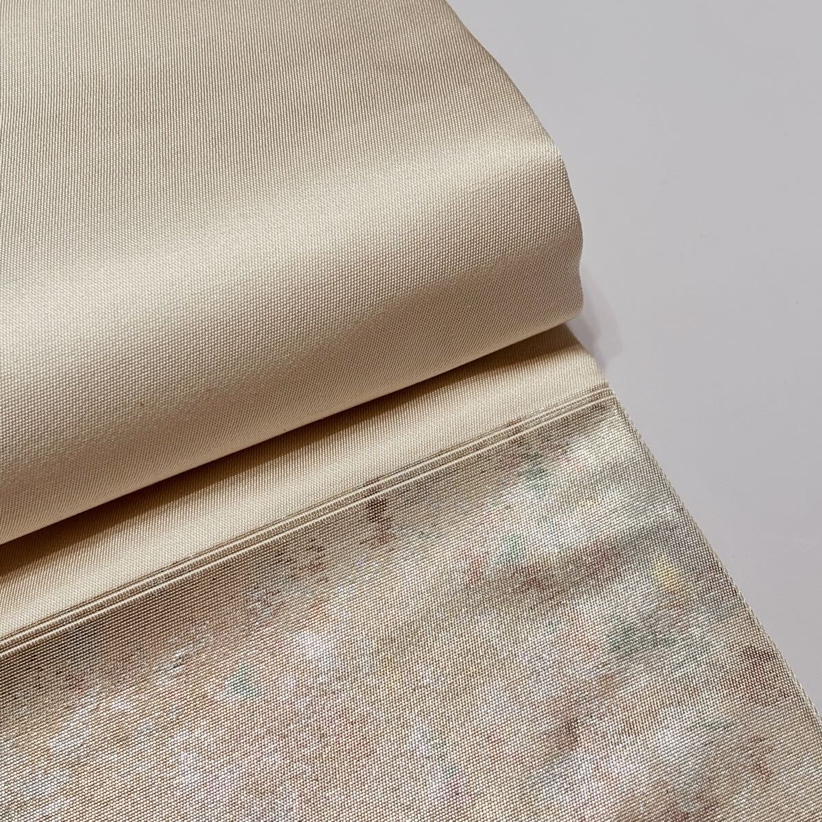淡いゴールドにピンクと水色の優しいニュアンスが映える名古屋帯。色合いが上品で美しいデザインの帯です。