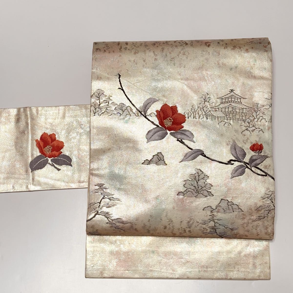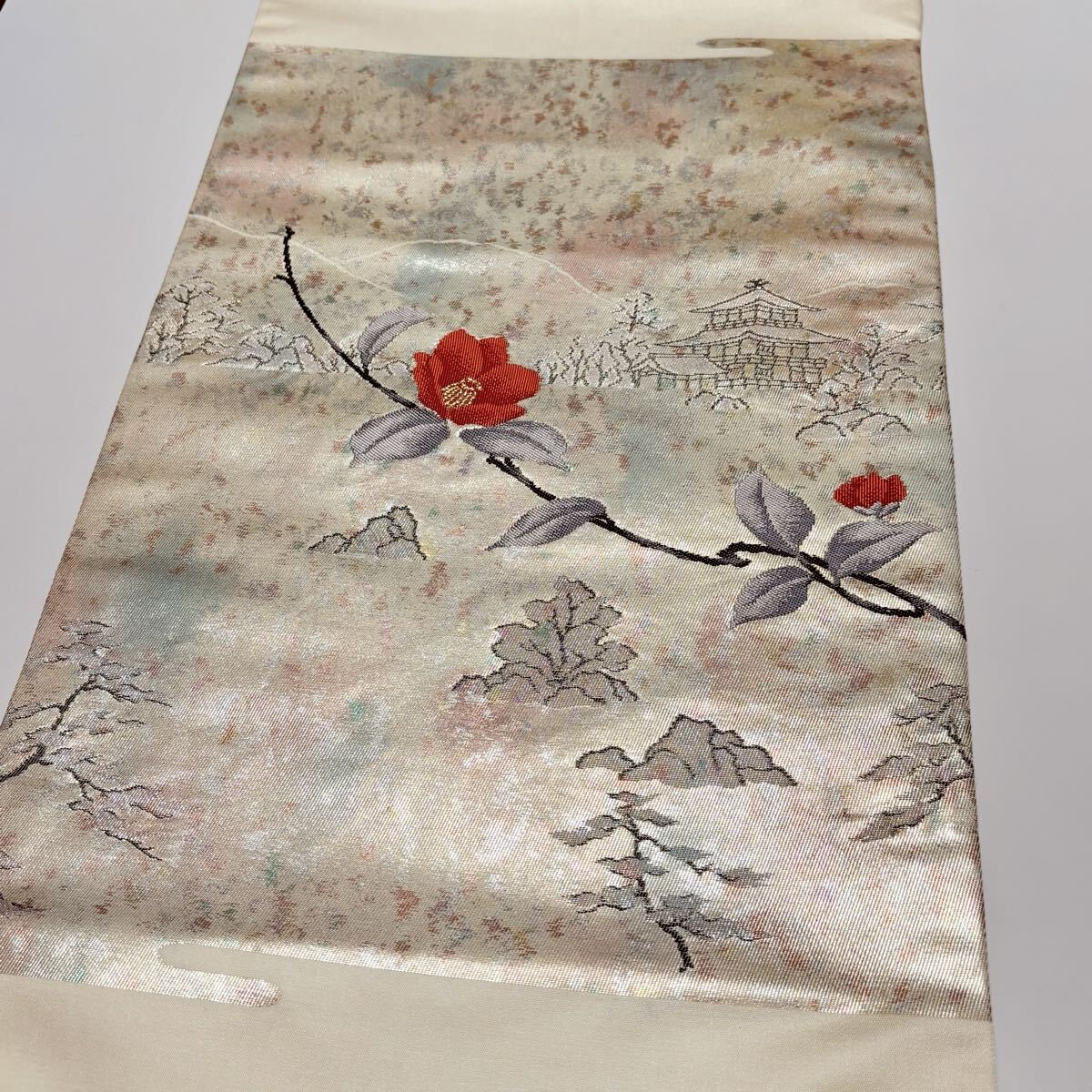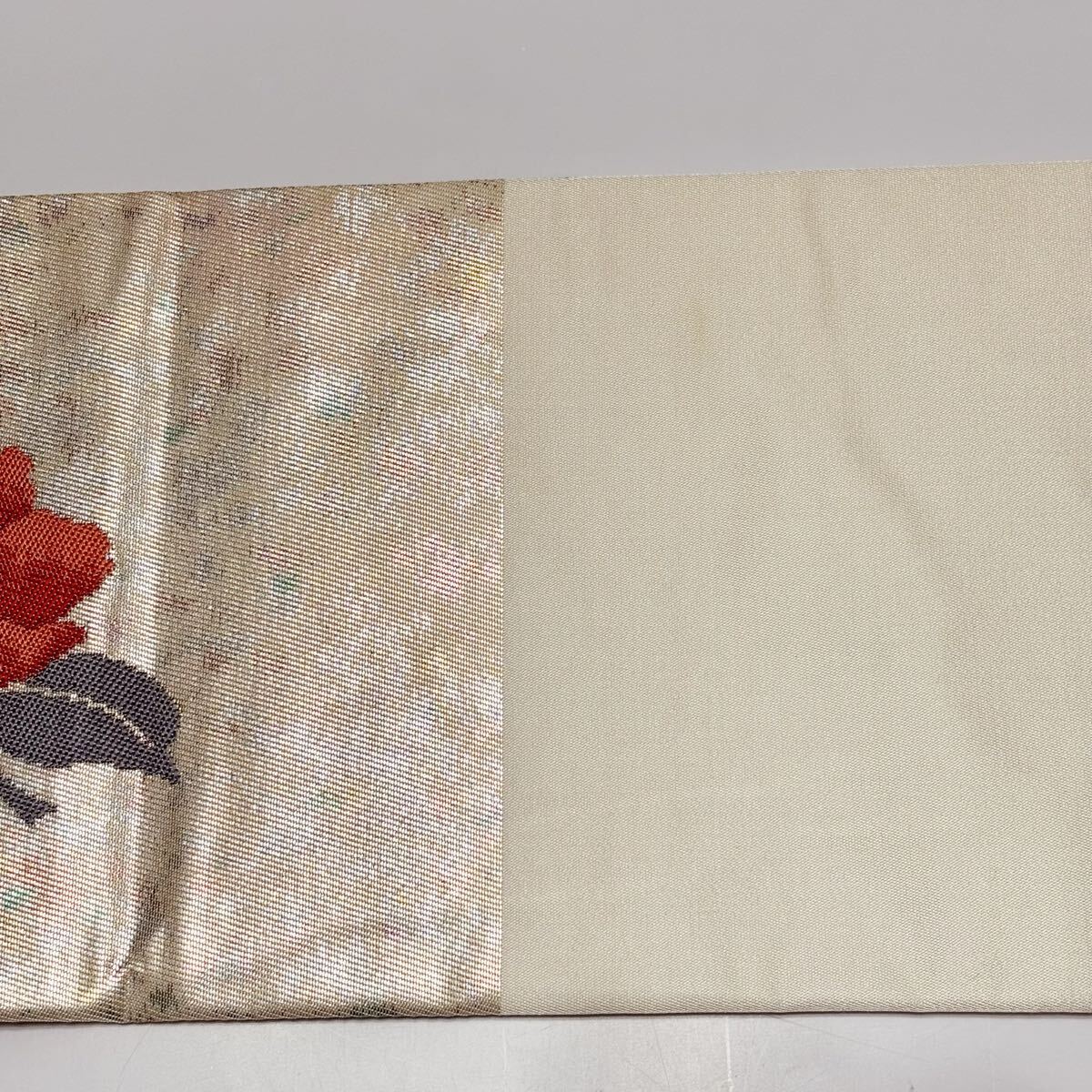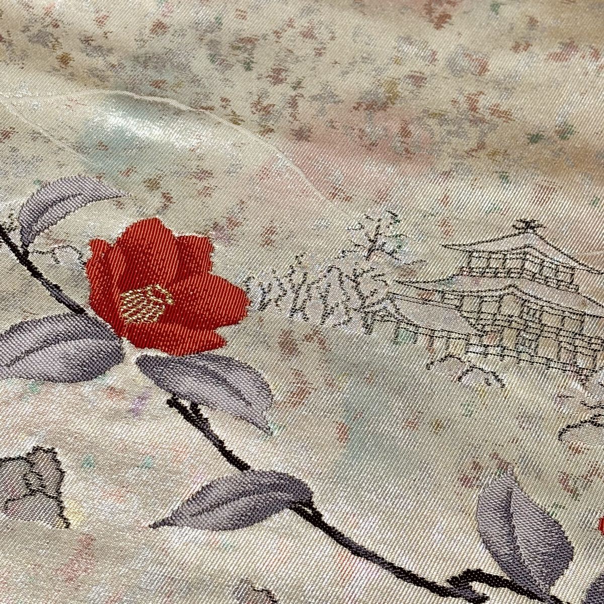 淡いゴールドにピンクと水色の優しいニュアンスが映える名古屋帯。色合いが上品で美しいデザインの帯です。