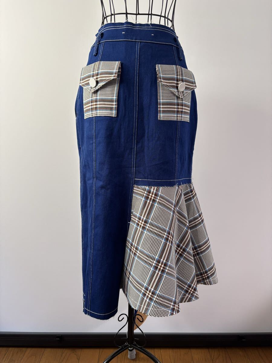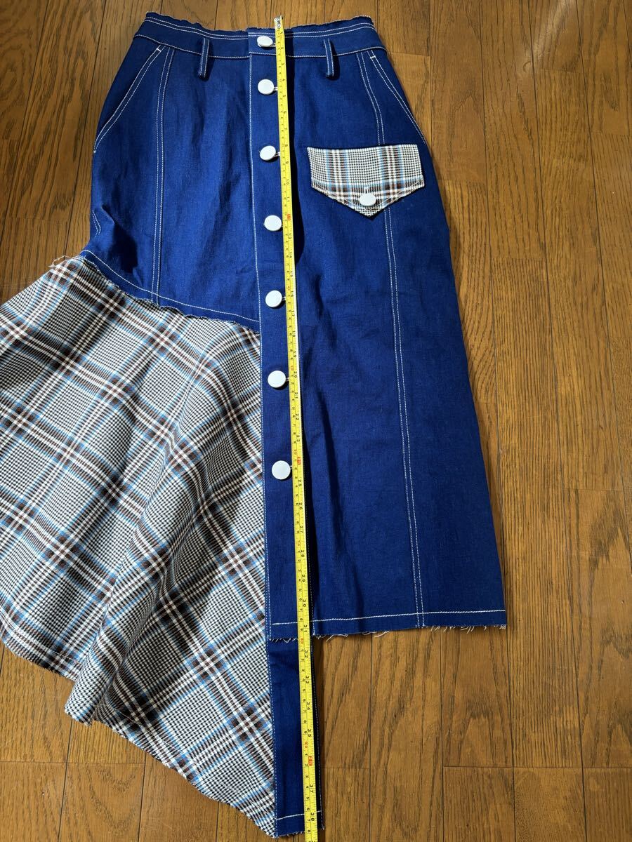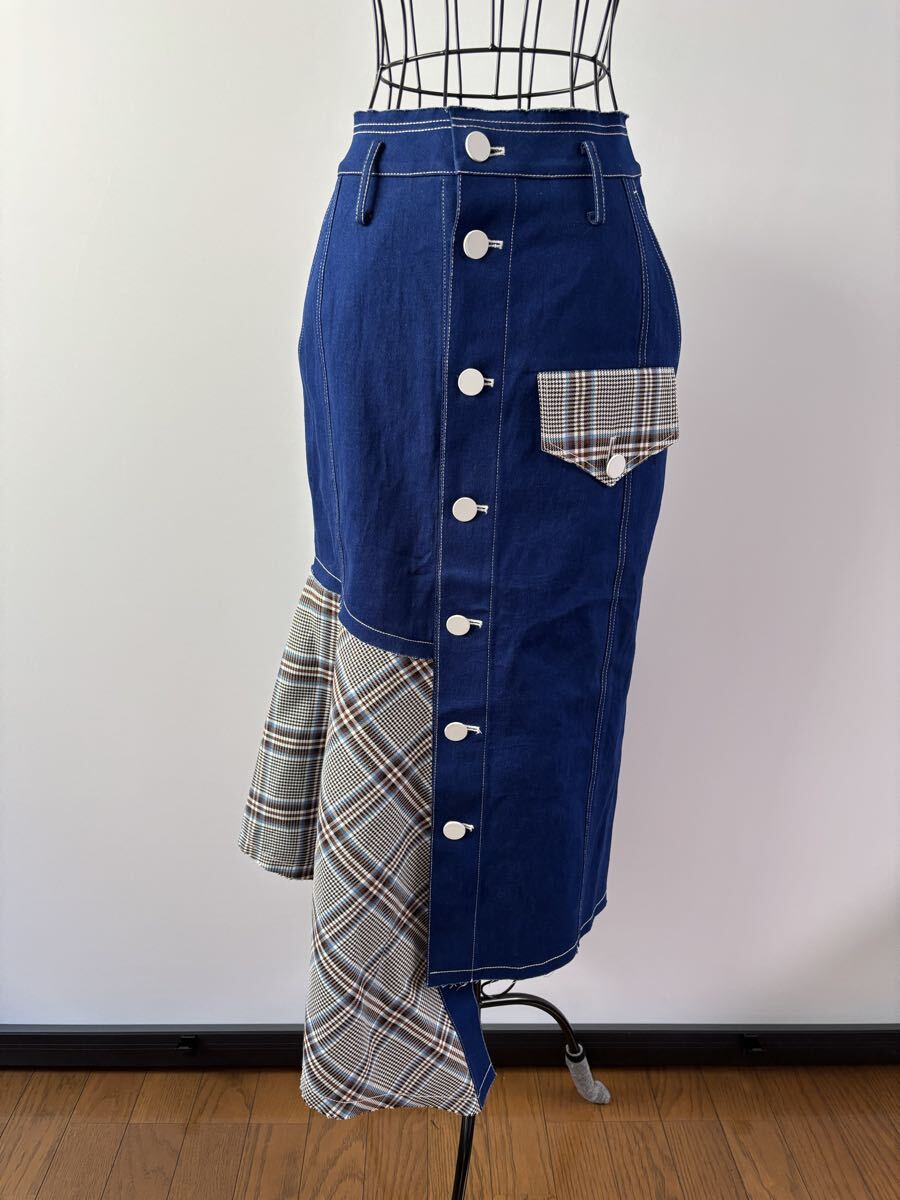 デニムとチェック柄の切り替えデザインがおしゃれなアシンメトリースカート。