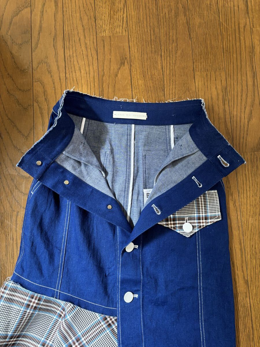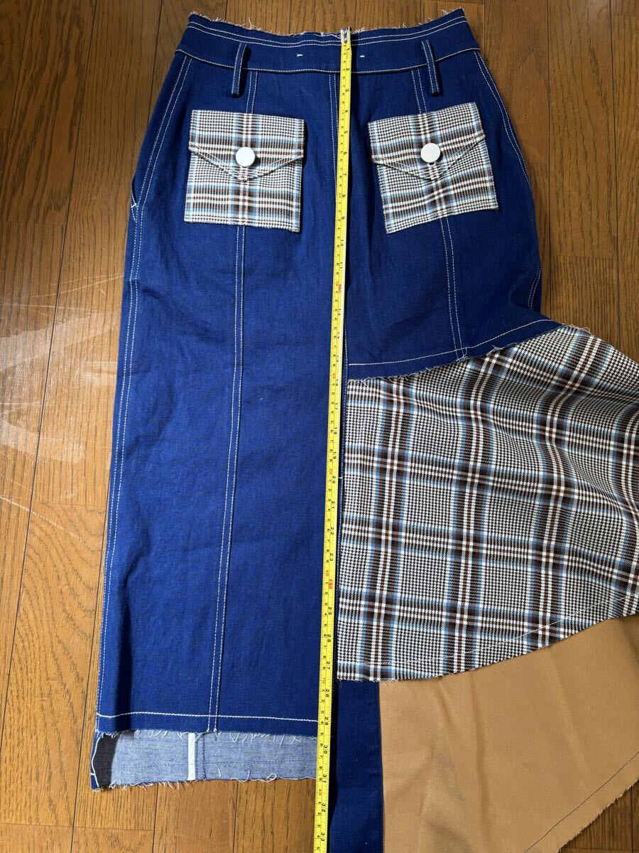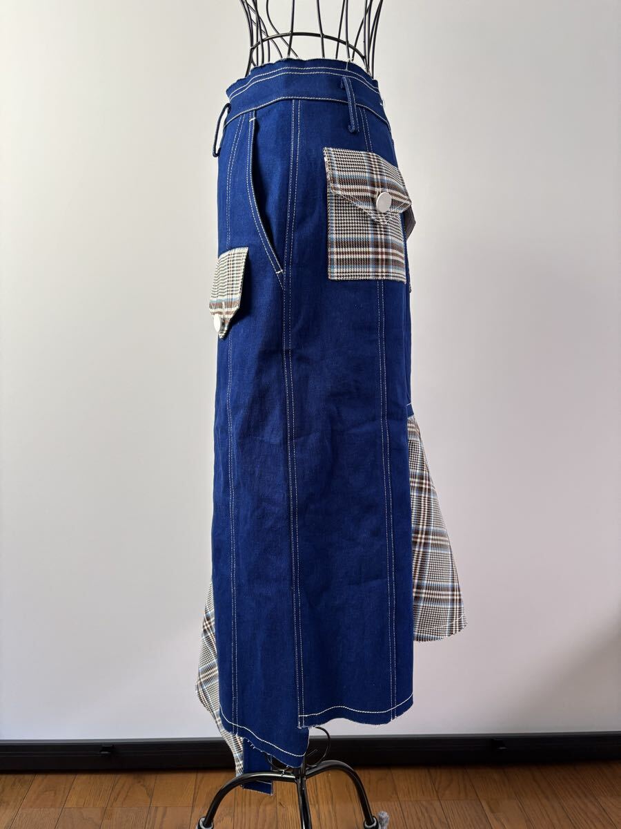 デニムとチェック柄の切り替えデザインがおしゃれなアシンメトリースカート。