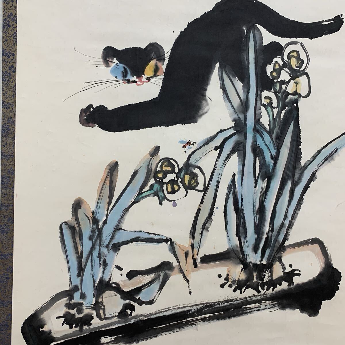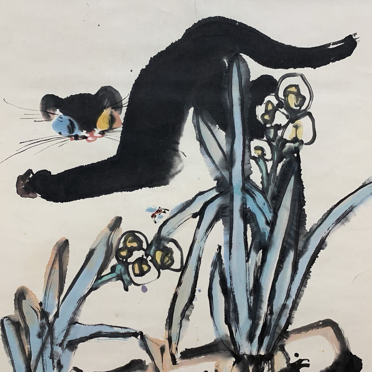 猫が水仙の花に来た蜂を見つけてじゃれているような絵である。
