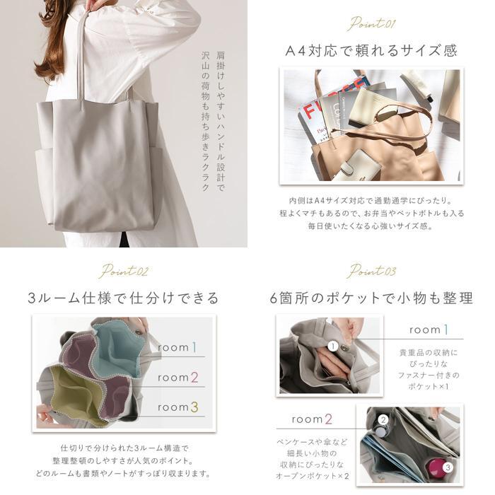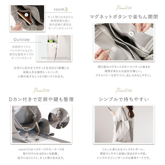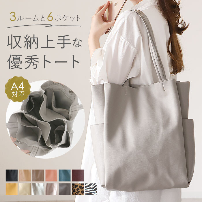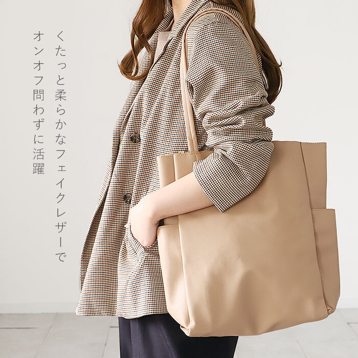 商品説明 | ・・・2つの仕切り&6つのポケットで、バッグの中をすっきり整理整頓♪「収納上手になれるトート」が登場。 ・バッグの中で小物が迷子になりにくい機能的な仕切り設計!荷物の定位置を決めることで、誰でも収納上手に♪ ・開口部はマグネットボタンで簡単開閉。 ・内側はA4サイズ対応。程よくマチがあり、長財布やメイクポーチなどお出かけに必要な小物がひとまとめ◎ ・前面・背面に仕切りポケットを設け、ノートやファイルなどが折り曲がることなく持ち運び可能。 ・小物収納に便利なファスナーポケット×1やオープンポケット×1、スリムボトルがすっぽり収まる縦長オープンポケット×2を装備。 ・パスケースや鍵を取り付けできるDカン付き。 ・外側両サイドに、500mlペットボトルや折りたたみ傘を収納できるオープンポケットを1つずつ配置。 ・柔らかく滑らかな手触りのフェイクレザー素材を使用。肩に掛けても手持ちでも馴染みやすく、オンオフ問わず活躍! ・シンプルなデザインで、ジェンダーレスにコーディネートできるアイテム。 |