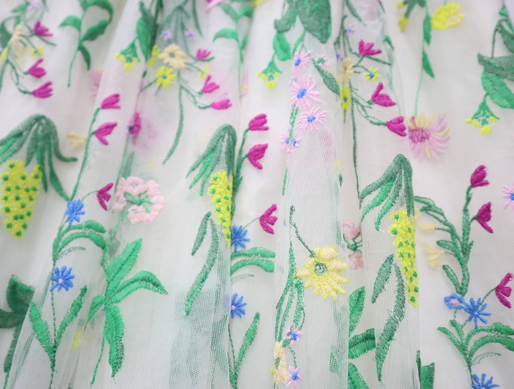 【素材】表地:ナイロン100% 刺繍糸:ポリエステル100% 別布チュール:ポリエステル100% 別布ベルト:ポリエステル100% 裏地:ポリエステル100%