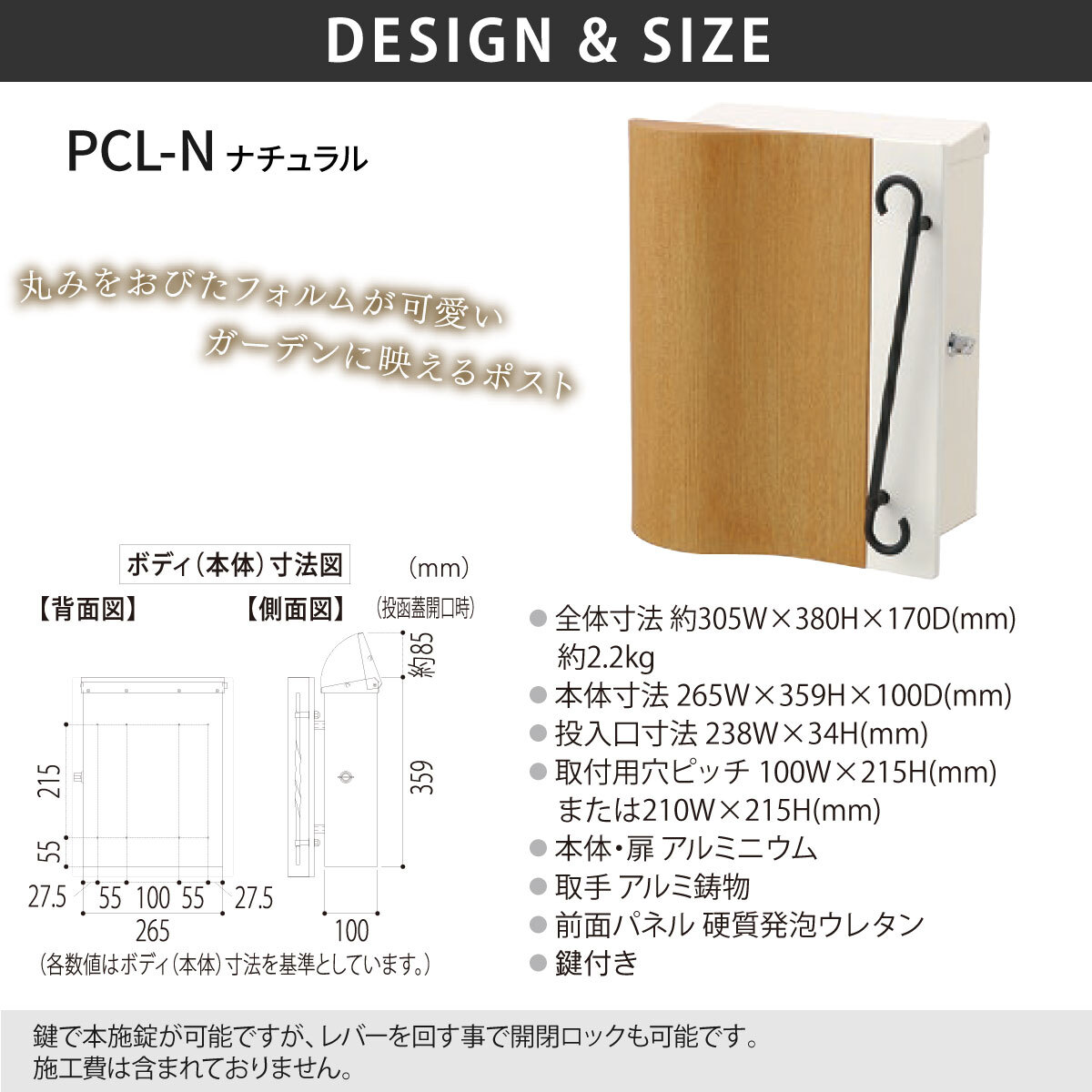 商品仕様 | ● 全体寸法 約305W×380H×170D(mm) 約2.2kg ● 本体寸法 265W×359H×100D(mm) ● 投入口寸法 238W×34H(mm) ● 取付用穴ピッチ 100W×215H(mm) または210W×215H(mm) ● 本体・扉 アルミニウム ● 取手 アルミ鋳物 ● 前面パネル 硬質発泡ウレタン ● 鍵付き |