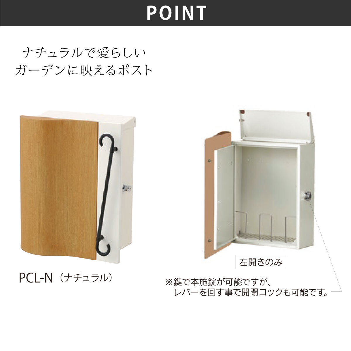 商品詳細 | ナチュラルで愛らしいガーデンに映えるポスト 壁面取り付けの他、ポストスタンド(TYPE-A/PALACIER)、機能門柱(DELIE/ROOK/BONHEUR/TIM/VESTI)への設置も可能です。 |