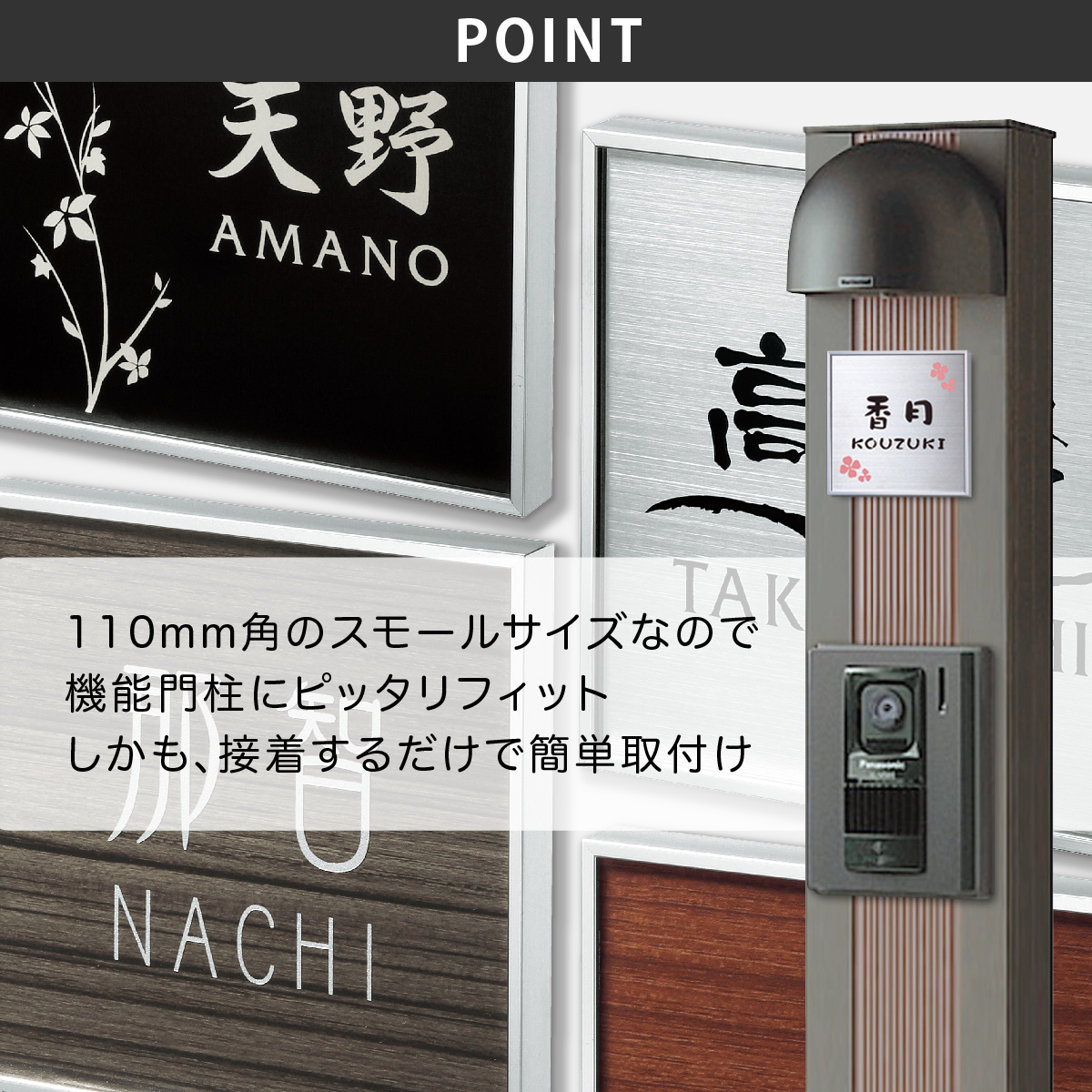 | 商品詳細 | アルミフレームにステンレス、アルミなどのプレートをはめ込んだ高級感のある表札です。110mm角のスモールサイズなので、機能門柱にピッタリフィット。しかも接着するだけで簡単取付け。 |