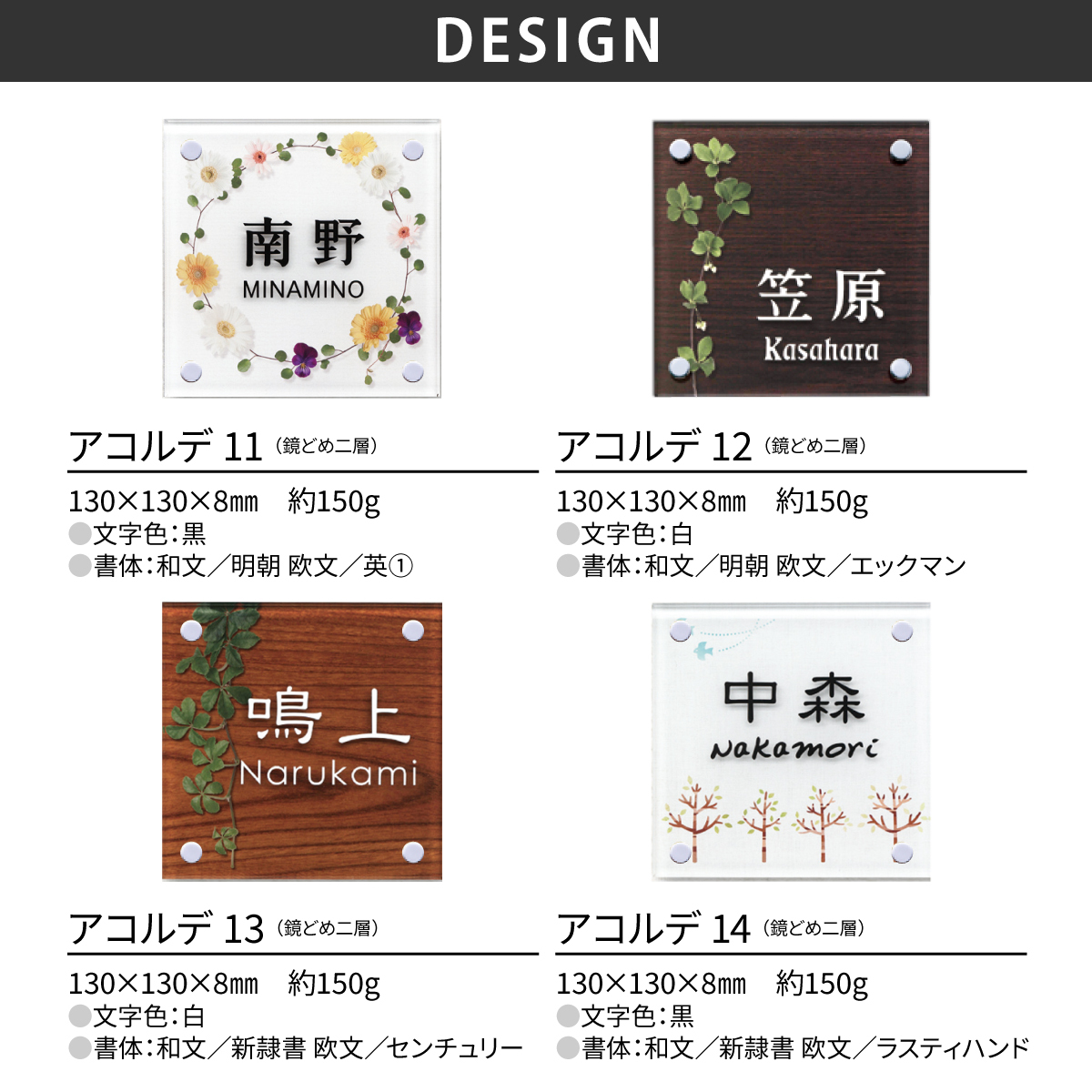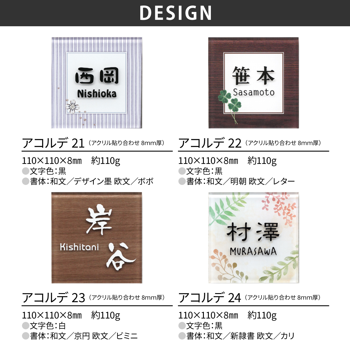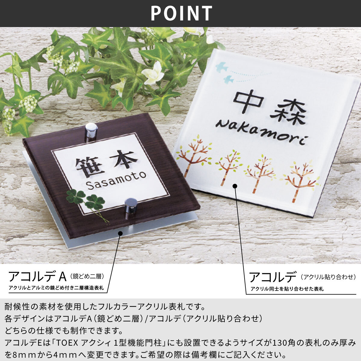 | 商品詳細 | 耐候性の素材を使用したフルカラーアクリル表札です。 他の表札では味わえない色とりどりの表情を、戸建て・マンション・機能柱など様々な場所で演出できます。 タイプは「アクリル張り合わせ8mm厚」と「鏡どめ二層24mm厚」がございます。 |