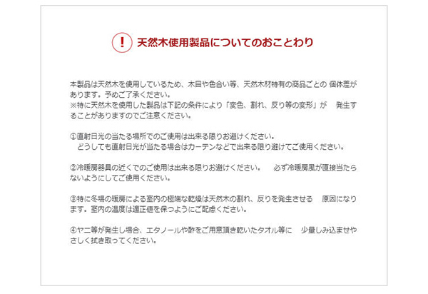 本製品は天然木を使用しているため、木目や色合い等、天然木材特有の