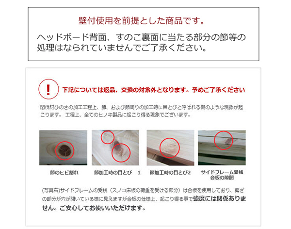 ベットボード背面、すのこ裏面に当たる部分の節等の