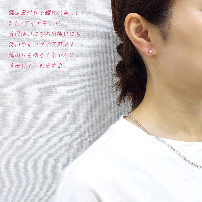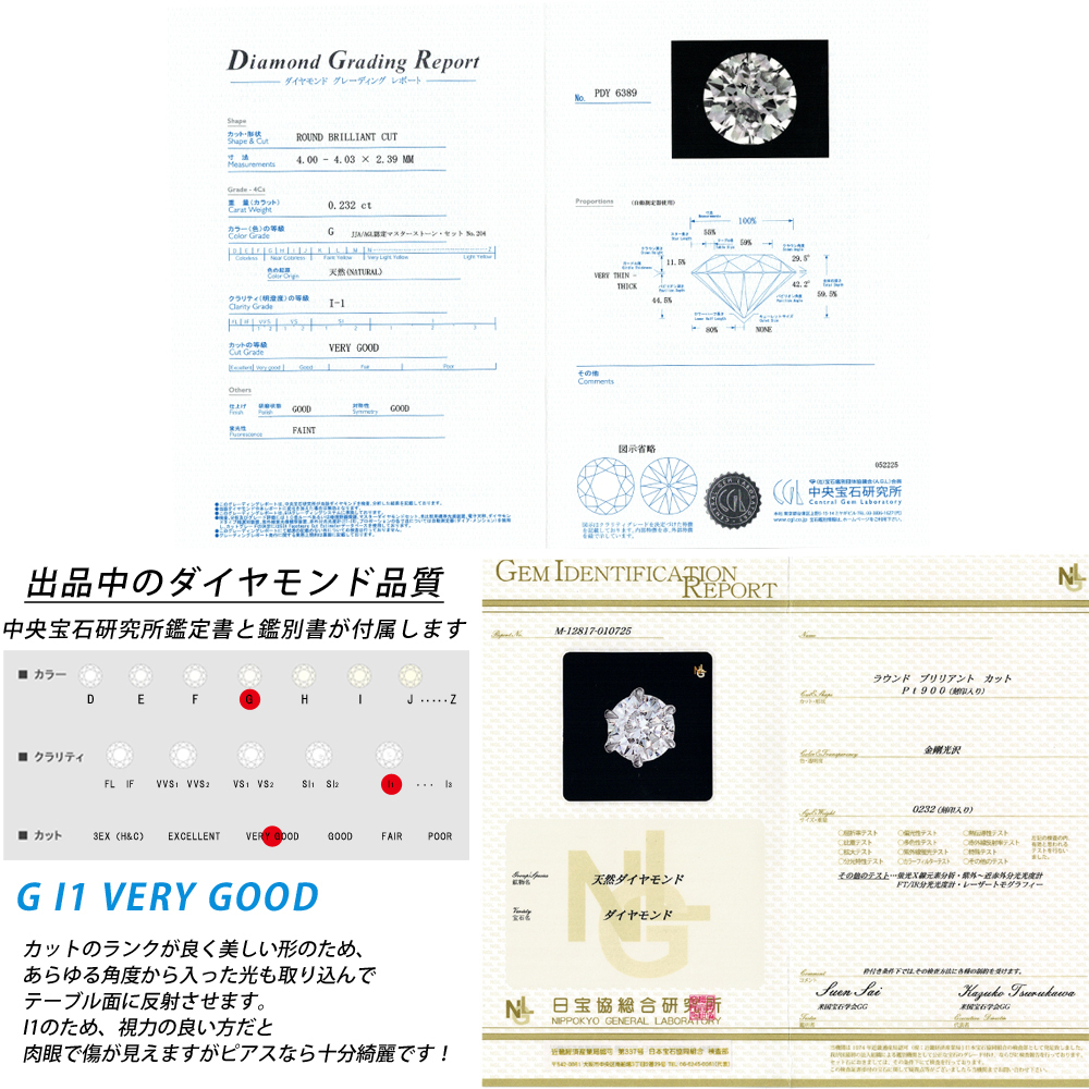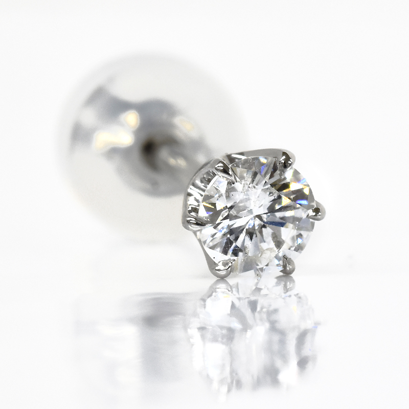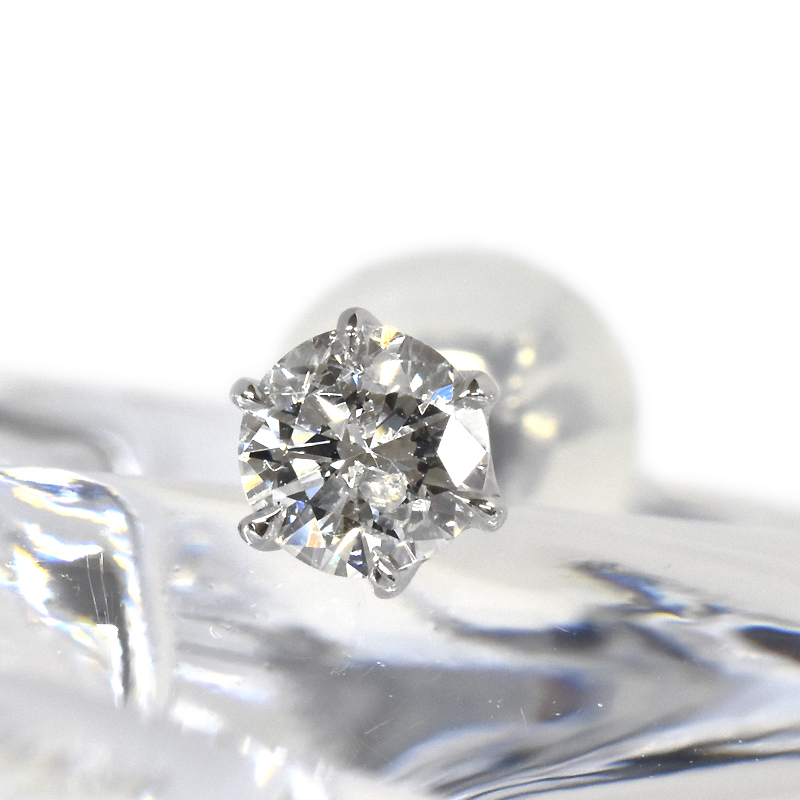 サイズ・品質 | 0.232ct G I1 VERYGOOD 中央宝石研究所鑑定書付き 直径 約 4.4 mm前後 高さ 約 3.5 mm ※ポスト:長さ 約 11.0 mm/太さ 約 1.0 mm(18G)です。 重量 約 0.4 g(キャッチ除く) |