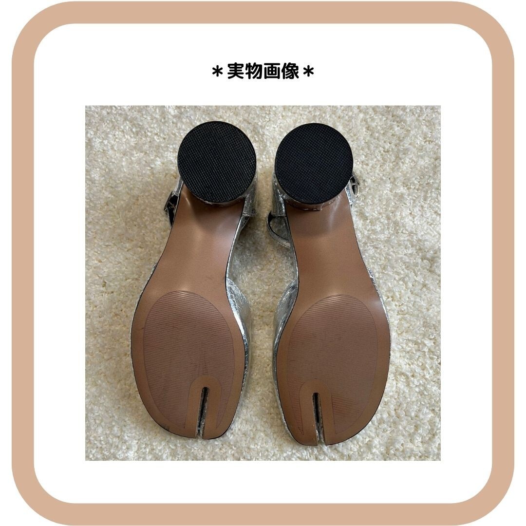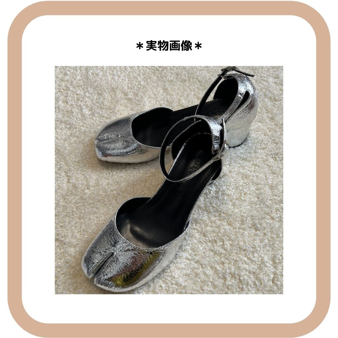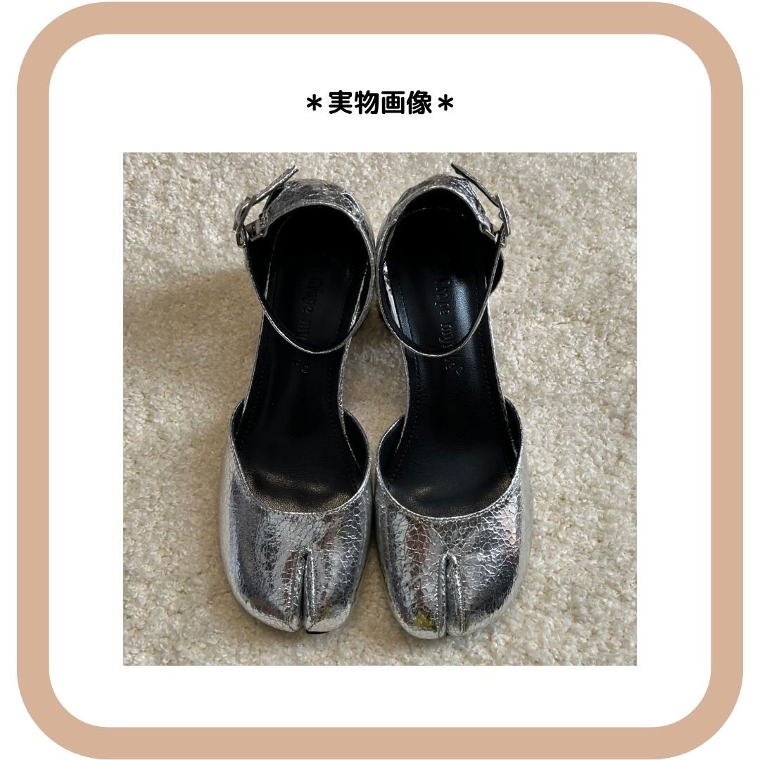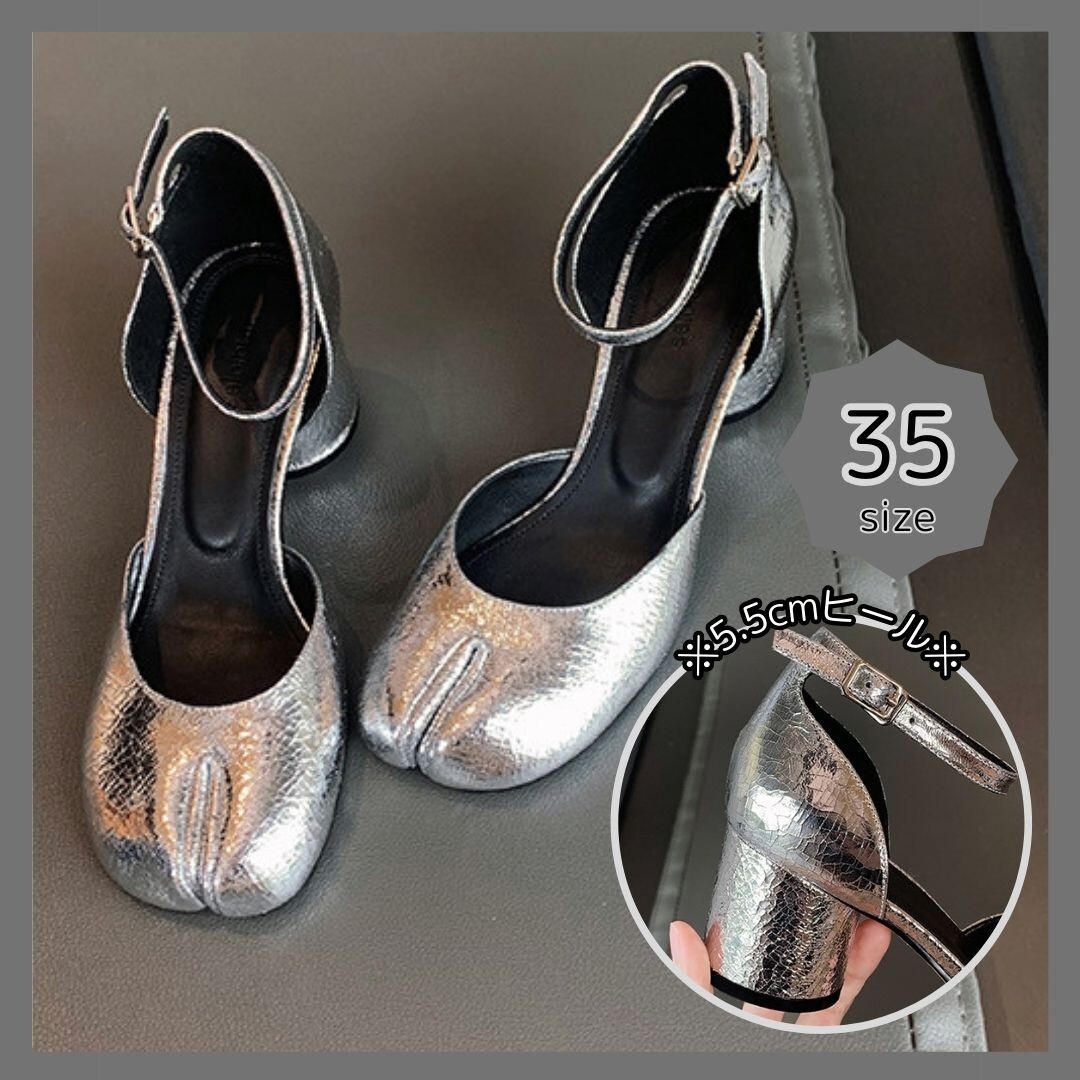 足袋パンプス 足袋シューズ チャンキーヒール 個性的 歩きやすい 安定感 おしゃれ 太めヒール 美脚 ストラップ 大人 上品 シルバー 35