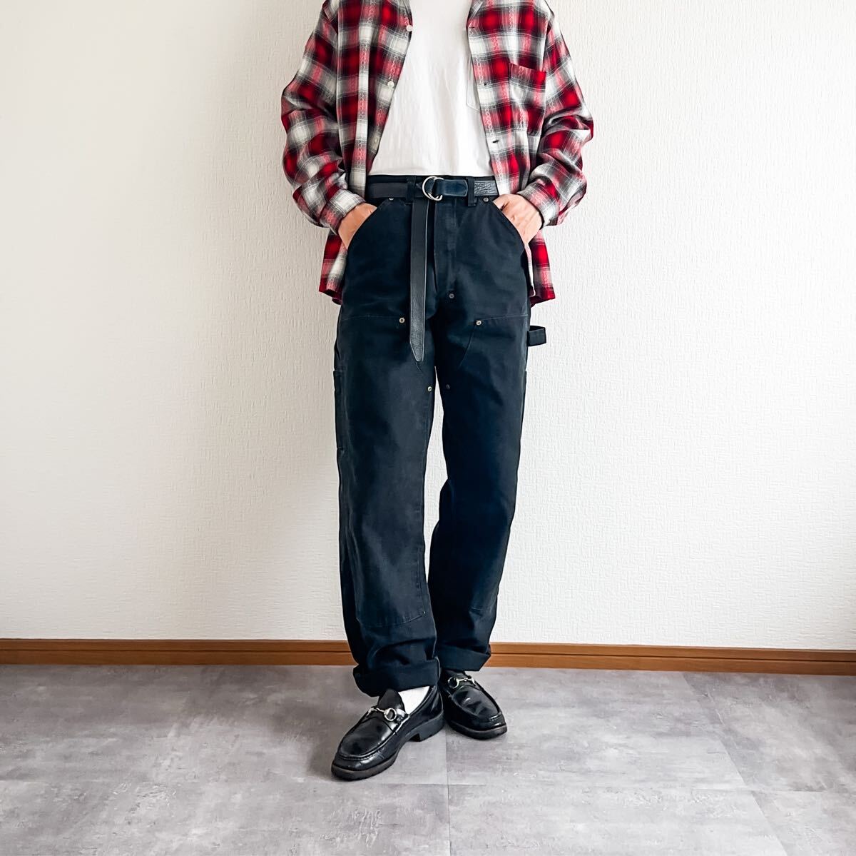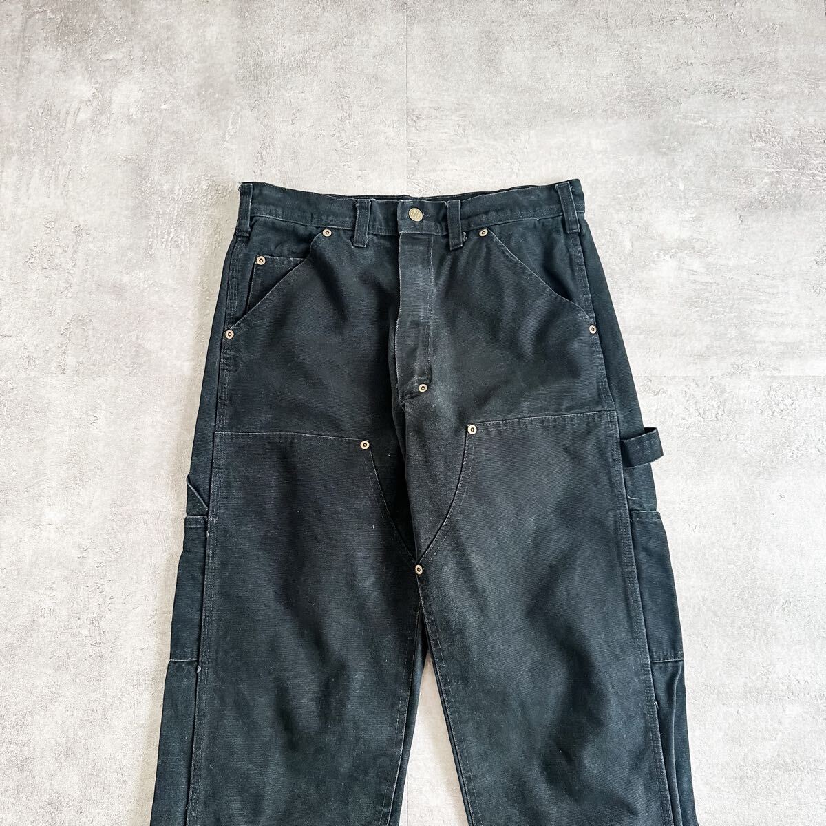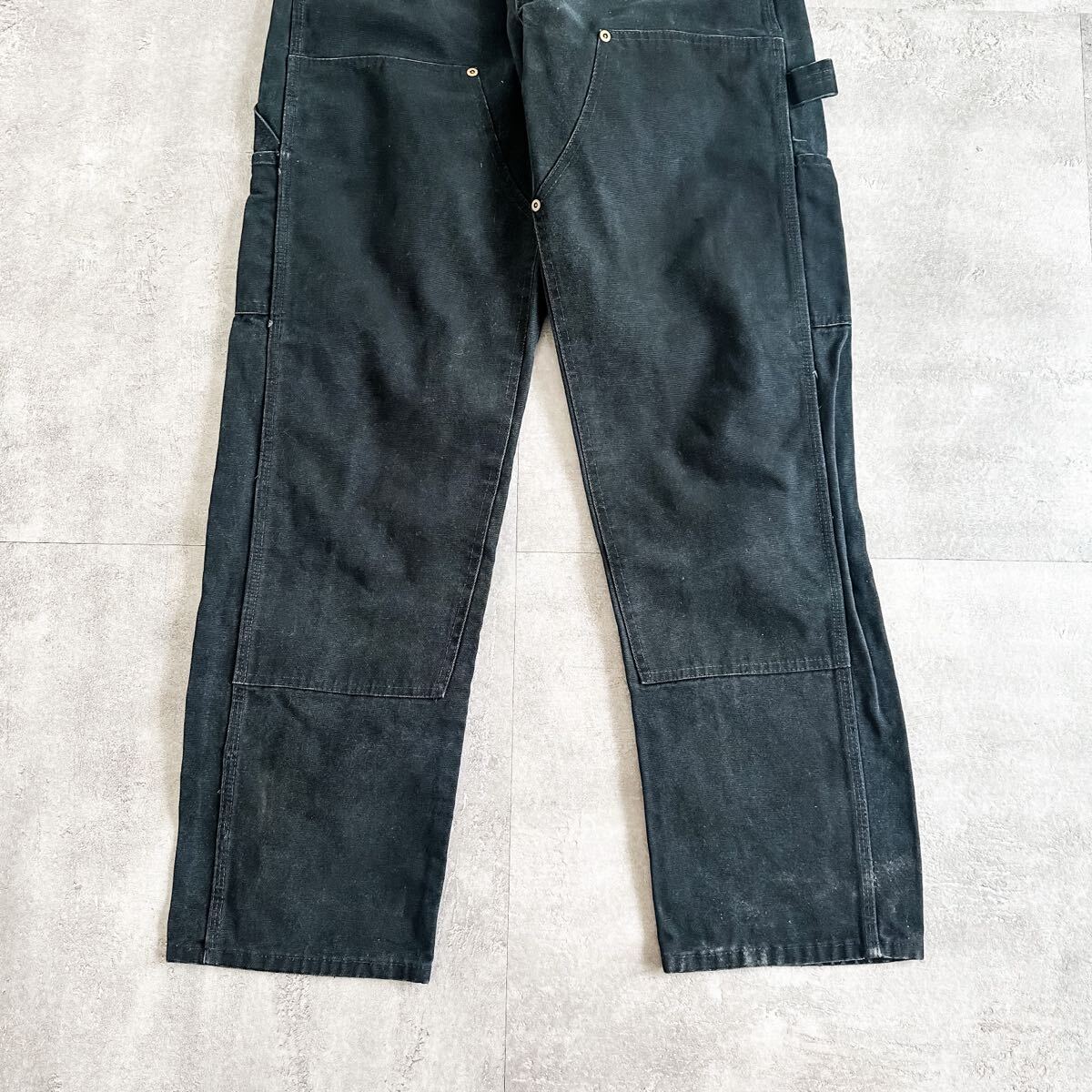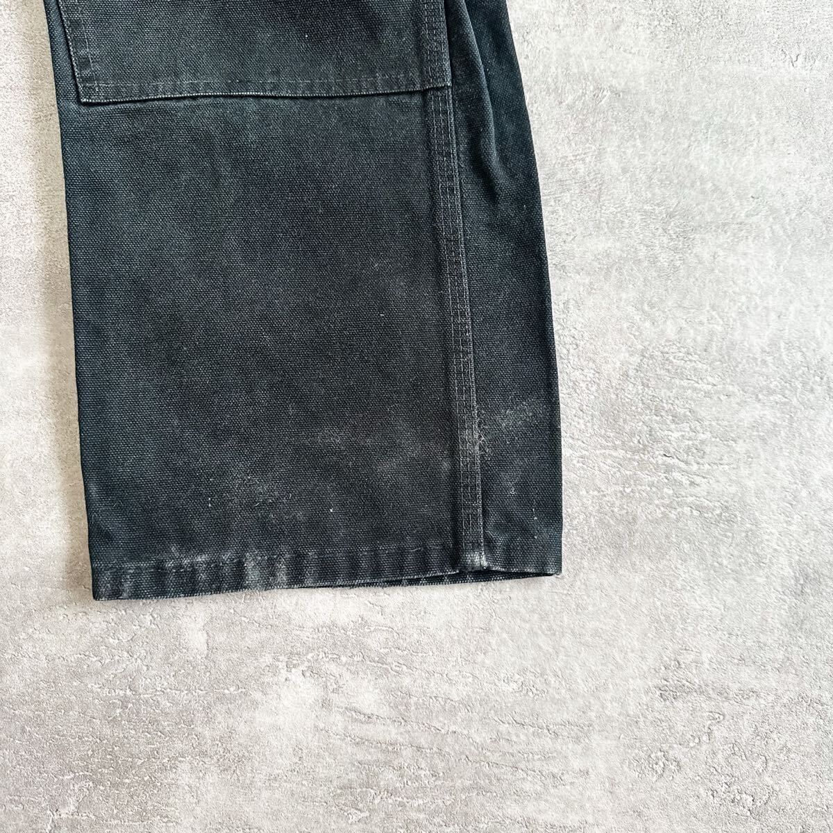 硬くて丈夫な質感のダック生地に膝部分には生地が2枚重ねになったダブルニー仕様、しかもブラックカラーと素晴らしい条件の一本。