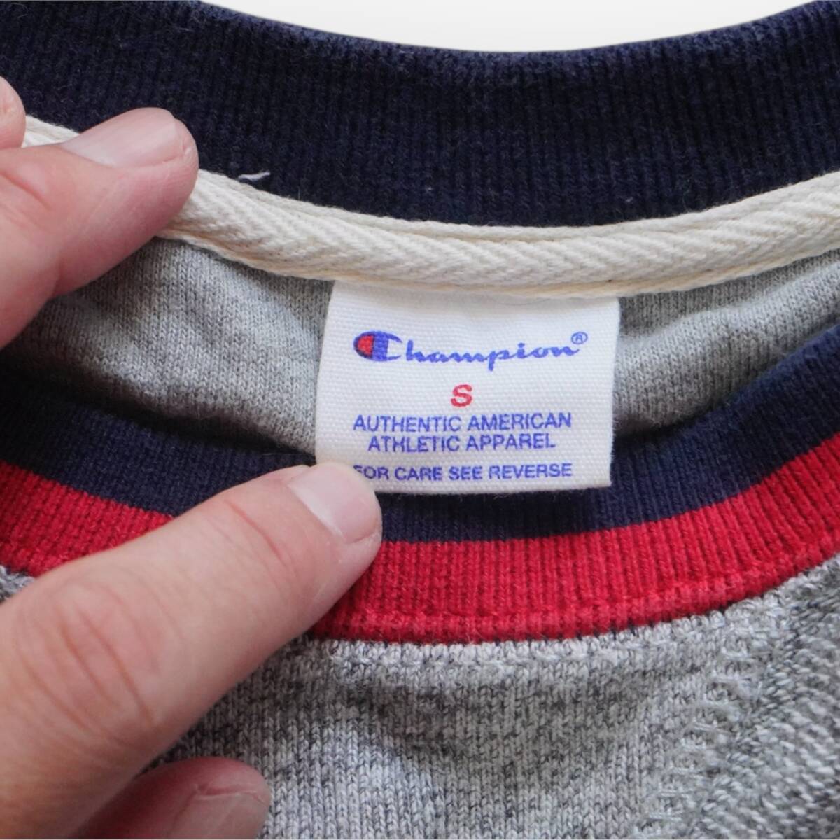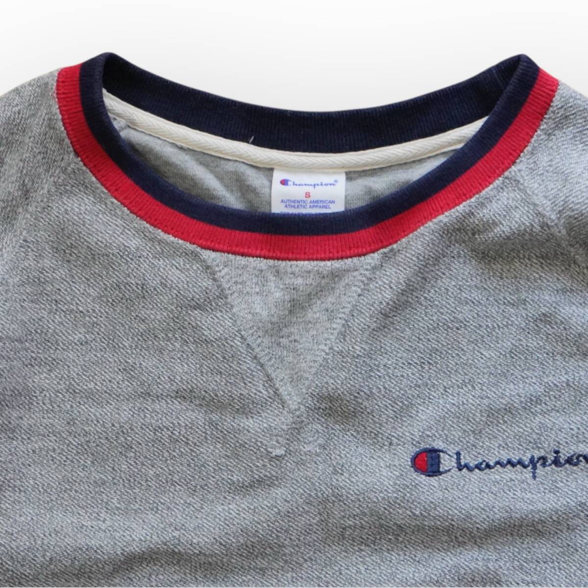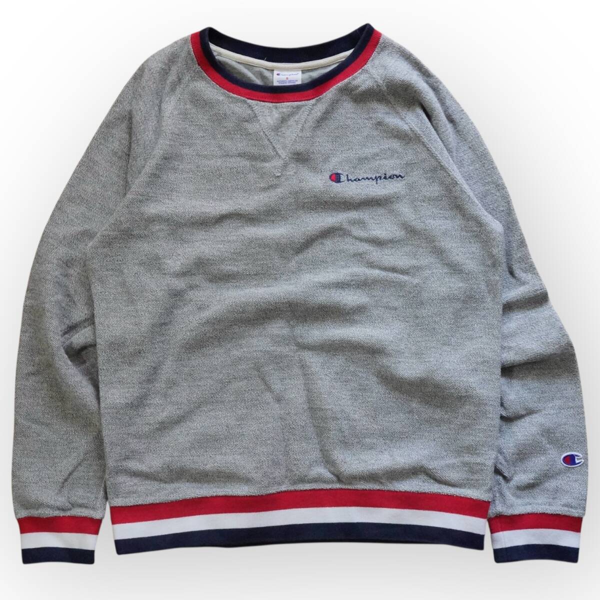 J948@ Champion スウェット Sサイズ クルーネック リブライン ロゴワンポイント ラグランスリーブ スポーティ トラッド カジュアル