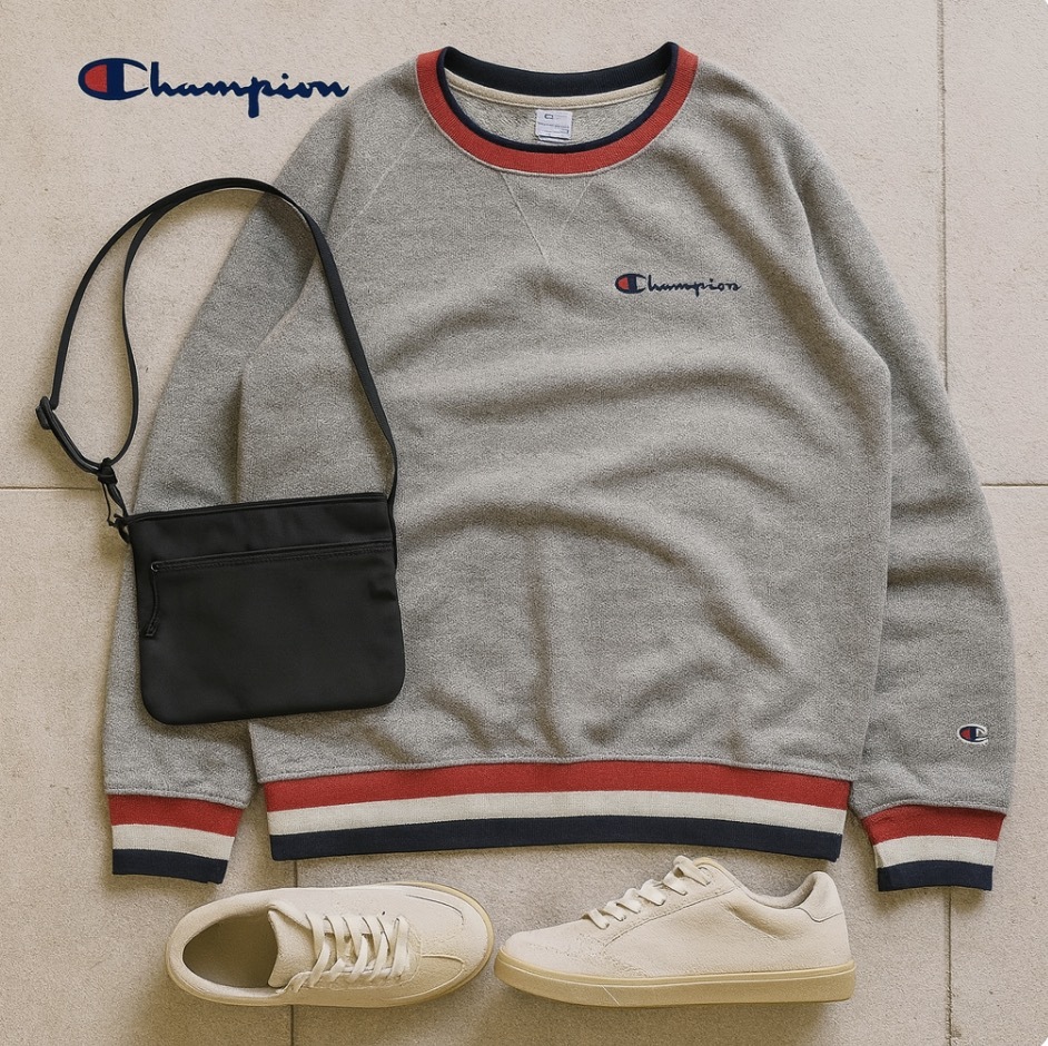 クルーネックに加え、裾と袖口のリブラインや胸元のロゴ刺繍が特徴です。