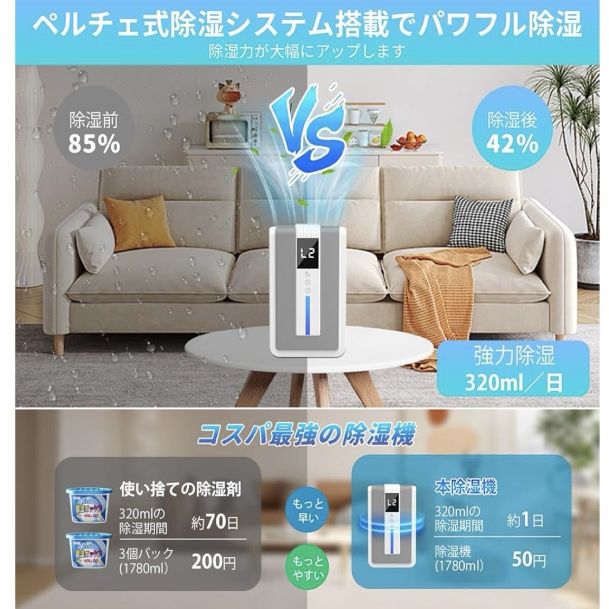 湿気に敏感なペルチェ式といわれる半導体式が採用されて、アップグレード吸気口、一日あたりの除湿量はなんと320mlです!(80%RH、室温30℃の環境条件でテスト)ダニ・結露・異臭・カビなど湿気によるいろんな悩みを一気に解決します。 夏の梅雨時の衣類乾燥・除湿や冬の室内干しに最適、強力な除湿能力で不快な湿気を強力に取り除き、一年中快適な室内環境を実現します!